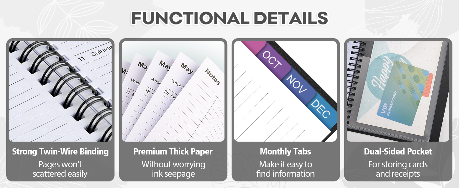 هدية مثالية - يشتمل هذا المخطط الأسبوعي والشهري لعام 2026 على جيوب داخلية مزدوجة الجوانب و12 علامة تبويب شهرية، وهو مثالي لتدوين الملاحظات والتخطيط اليومي والتنقل بين العمل أو المدرسة أو المنزل. هدية مدروسة للأصدقاء أو العائلة أو المعلمين أو أي شخص لديه حياة مزدحمة - رائعة لأعياد الميلاد والمناسبات الخاصة. في حالة وجود أي مشكلات تتعلق بالجودة، يرجى الاتصال بنا عبر أمازون.