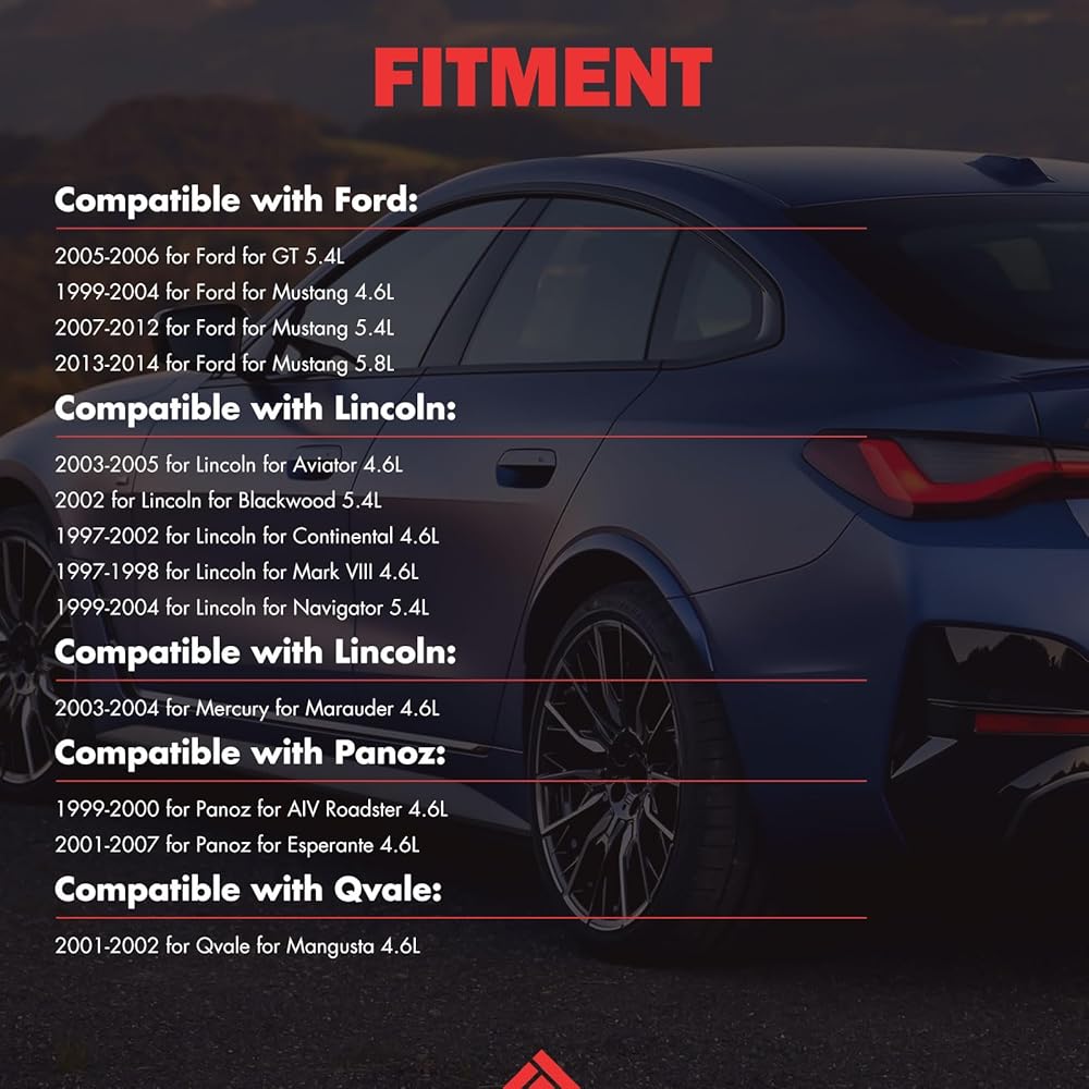 التطبيق: مجموعة حشية غطاء الصمام متوافقة مع 2005-2006 لـ Ford GT 5.4L؛ 1999-2004 لـ Ford Mustang 4.6L؛ 2007-2012 لـ Ford Mustang 5.4L؛ 2013-2014 لـ Ford Mustang 5.8L؛ 2003-2005 لـ Lincoln Aviator 4.6L؛ 2002 لـ Lincoln Blackwood 5.4 لتر؛ 1997-2002 لينكولن كونتيننتال 4.6 لتر؛ 1997-1998 لينكولن مارك الثامن 4.6 لتر؛ 1999-2004 لينكولن نافيجيتور 5.4 لتر؛ 2003-2004 ميركوري مارودر 4.6 لتر؛ 1999-2000 لبانوز AIV رودستر 4.6L; 2001-2007 لبانوز إسبيرانتي 4.6L; 2001-2002 لـ Qvale Mangusta 4.6L