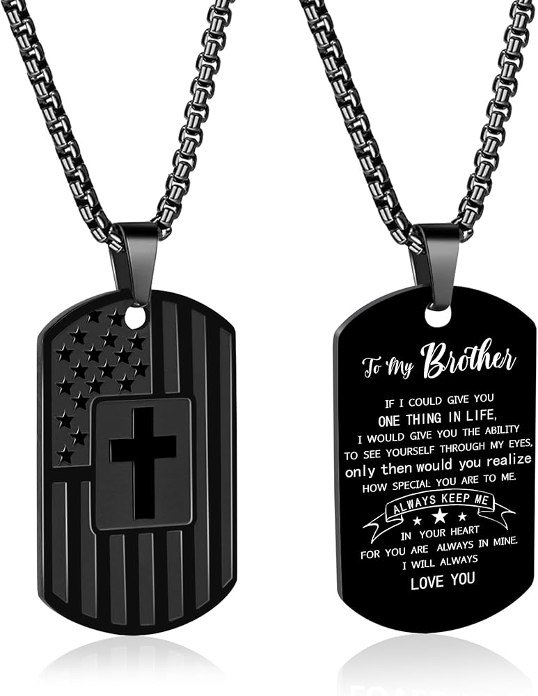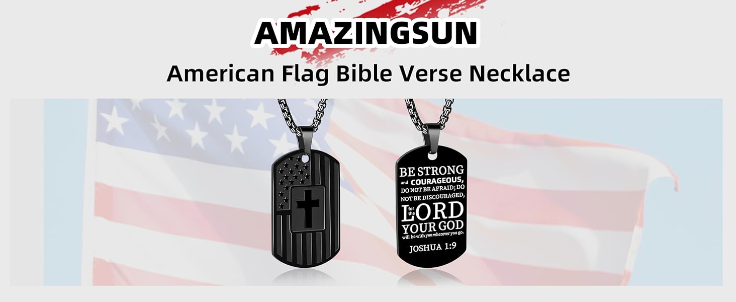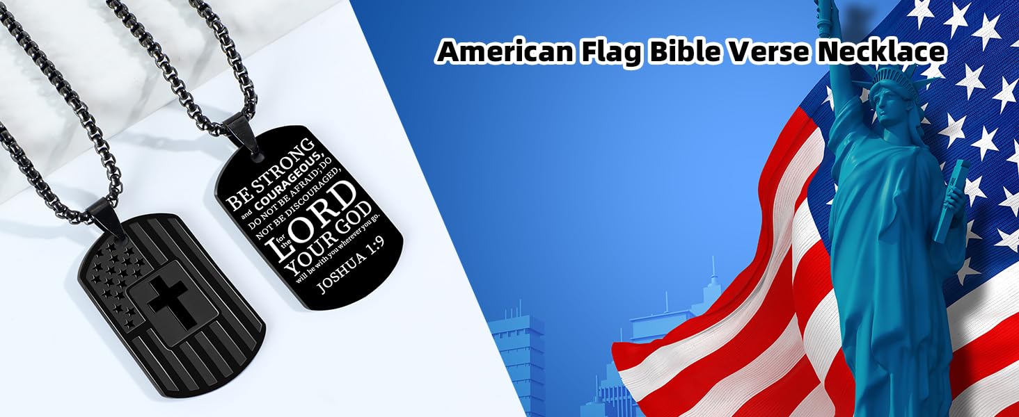 This American Flag Dog Tag Necklace is the perfect blend of patriotism and faith. Crafted from durable stainless steel, this necklace features the American flag, symbolizing love for one's country, and an inspiring Bible verse, reflecting devotion to one's religious beliefs. It's an ideal accessory for men who cherish both their patriotism and faith.Designed with comfort in mind, the pendant measures 1.6 x 0.9 inch, and comes with a 24 inch chain, making it a great size for most men. The rounded edges of the pendant ensure that it won't dig into your skin, allowing for all-day wear without discomfort.This necklace is the perfect gift for any occasion, from Christmas, Valentine's Day, and Father's Day, to Baptism, First Communion, or Confirmation. Whether for a husband, boyfriend, father, or brother, this necklace will remind them of their faith, their country, and their strength.Made from nickel-free, lead-free, and hypoallergenic stainless steel, it guarantees a comfortable wearing experience without any irritation. Whether worn daily or on special occasions, this necklace will serve as a lasting reminder of faith, pride, and love.