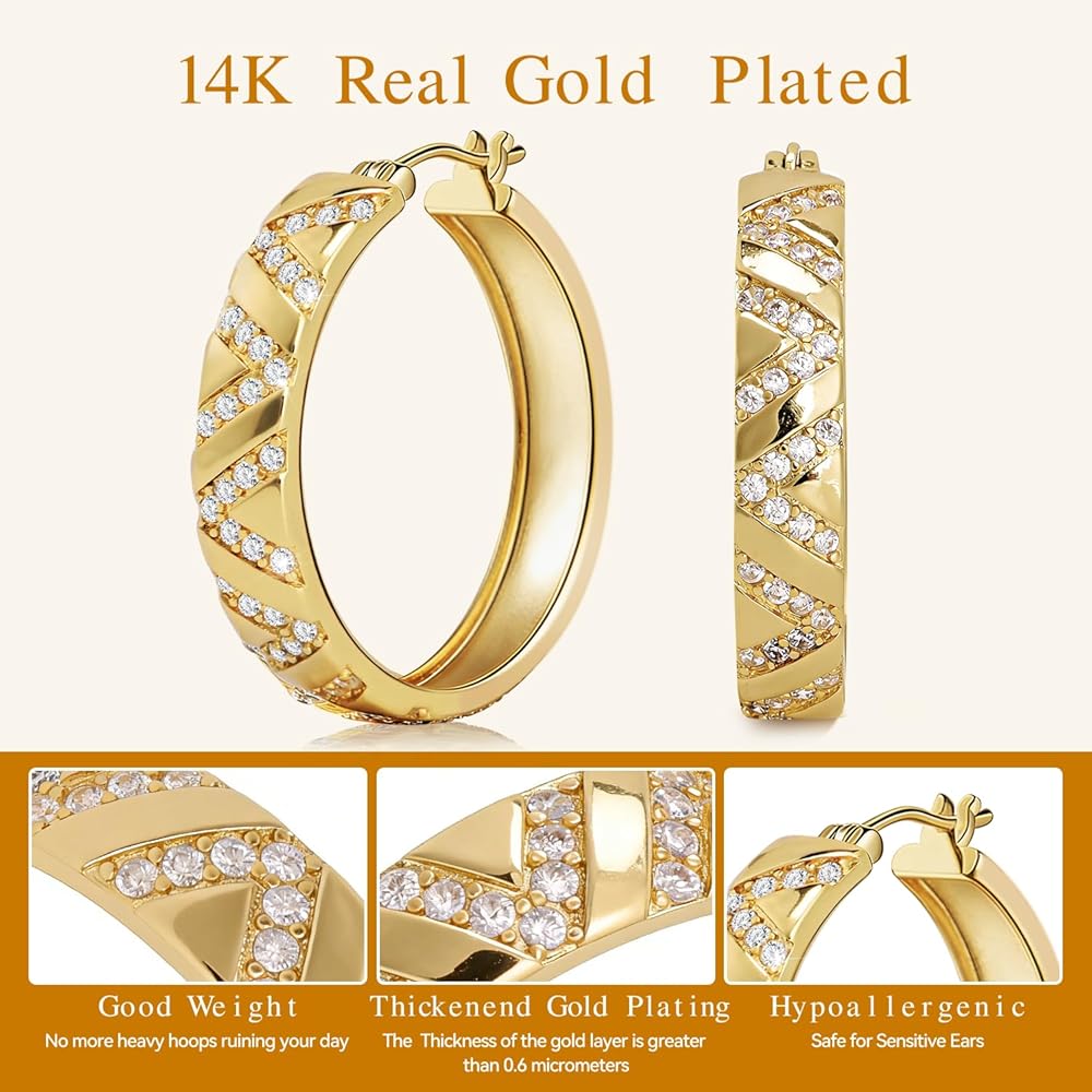 【زركونيا مكعب متقاطع متلألئ - تبرز بسهولة】 هل تريد أقراط زركونيا مكعبة لافتة للنظر؟ تحتوي أطواقنا الذهبية المكتنزة على زركونيا مكعب AAA مثبتة يدويًا مع إعداد آمن لتجنب الأحجار السائبة. قطر الأقراط الحلقية 25 مم يناسب المظهر الكاجوال والحفلات، مما يجعلها الأقراط الذهبية الأكثر تنوعًا للارتداء اليومي والحفلات.
