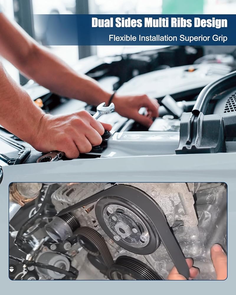 Turn off the engine, locate and loosen tensioner, remove the old belt, install the new belt, reset the tensioner, check alignment and tension, test drive at low speed