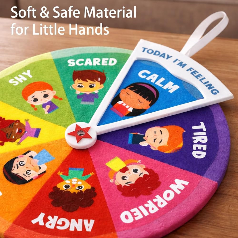 Soft Felt Construction: Made from durable synthetic fabric materials that provide a safe tactile experience; The emotion wheel features rounded edges and non-toxic components suitable for young children; This feelings wheel maintains its shape and colors through repeated use in various educational settings
