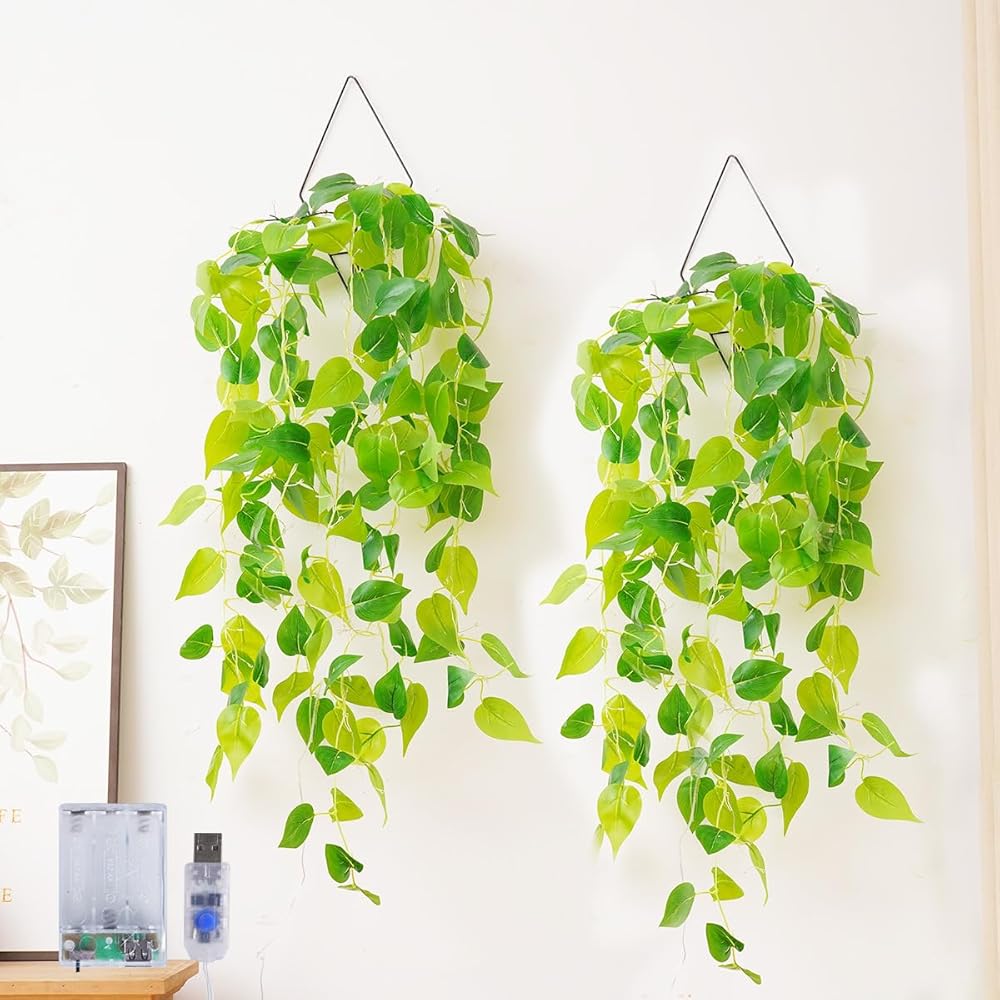 نباتات معلقة وهمية مقاس 41 بوصة مع أضواء اللبلاب الاصطناعي لديكور المنزل في غرفة النوم، شماعة نباتية مع نباتات مزيفة من الكروم المزيفة لسقف الحائط وغرفة النوم والمطبخ والمكتب الداخلي - عبوة من قطعتين