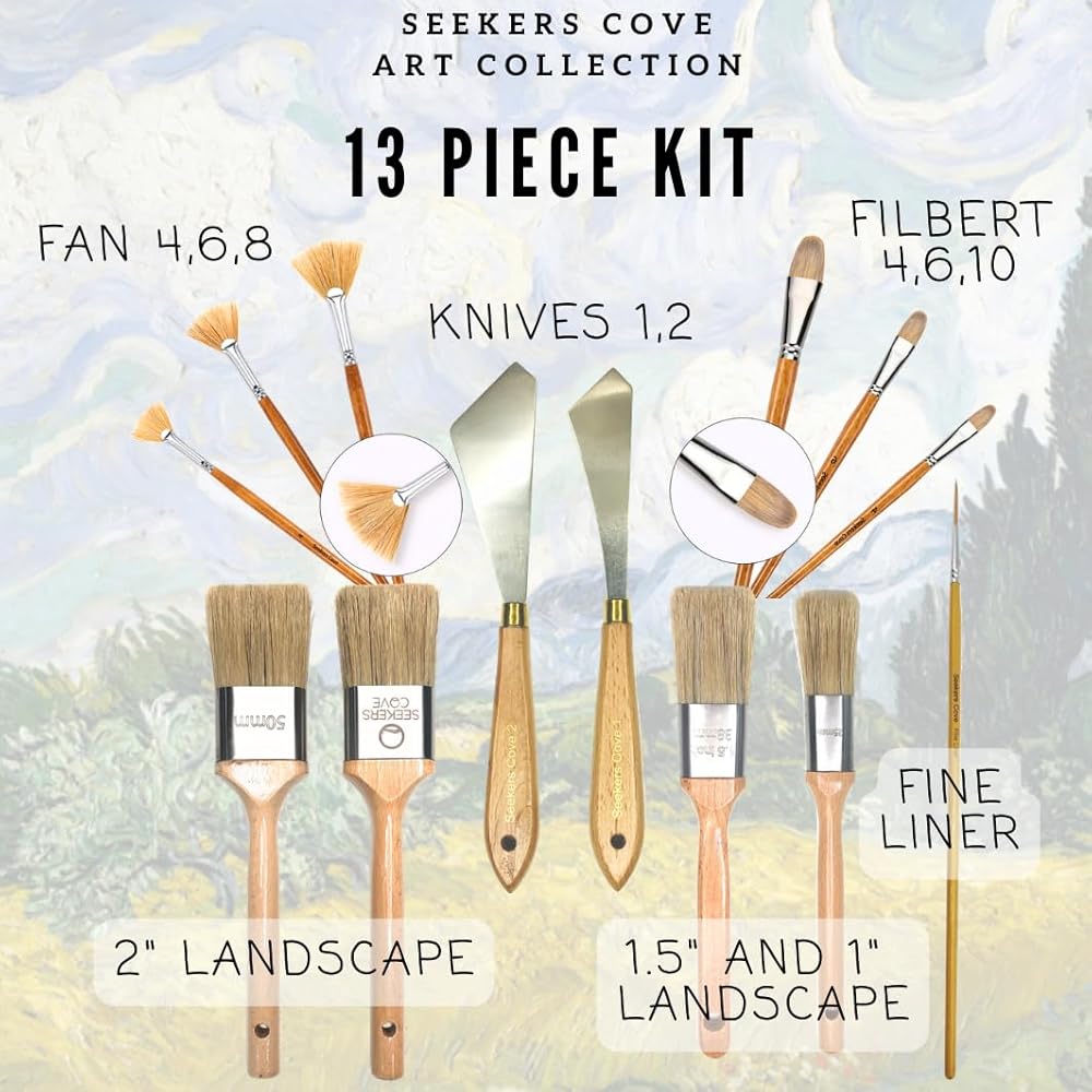 13 Piece professional painting kit design, to inspire and be comfortable and manuveralble. This kit comes with two 2" blenders, one 1" blenders, a 1.5" specialty blender, 3 fan, 3 flibert, 2 paint knives and a fineliner. All with natural bristles. Our blenders have been designed with a new style that inspires that has clean and professional cut handle beautiful stainless steel ferrul, thick full bristles, and round slender handles to encourage nimble and easy painting strokes.