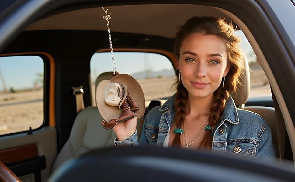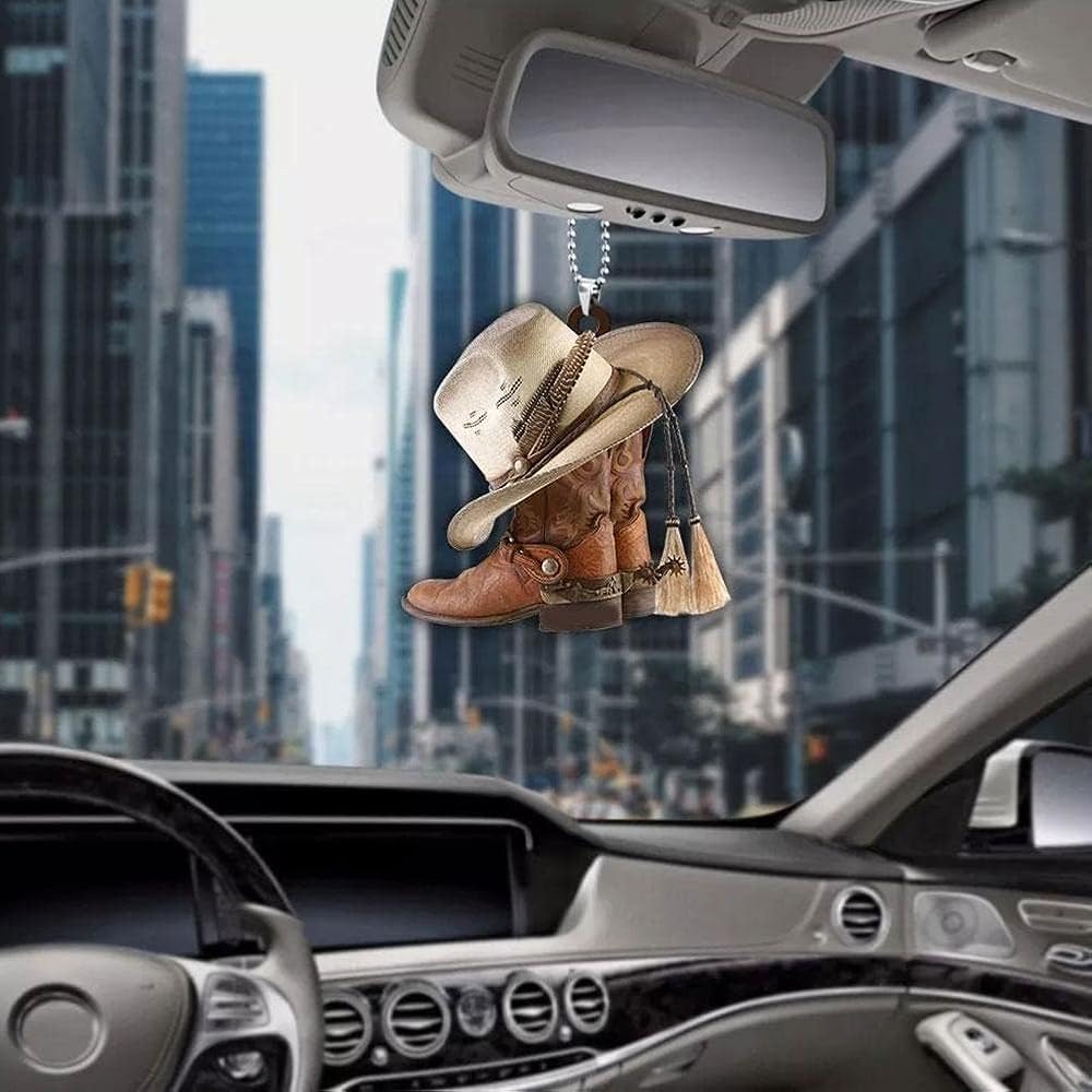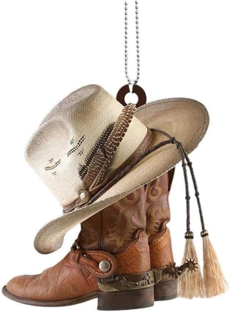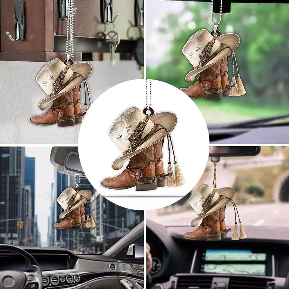 قلادة مرآة الرؤية الخلفية للسيارة بتصميم غربي من رعاة البقر، زينة معلقة من الأكريليك المسطح مع تصميم الأحذية والقبعات، سحر داخلي للسيارات