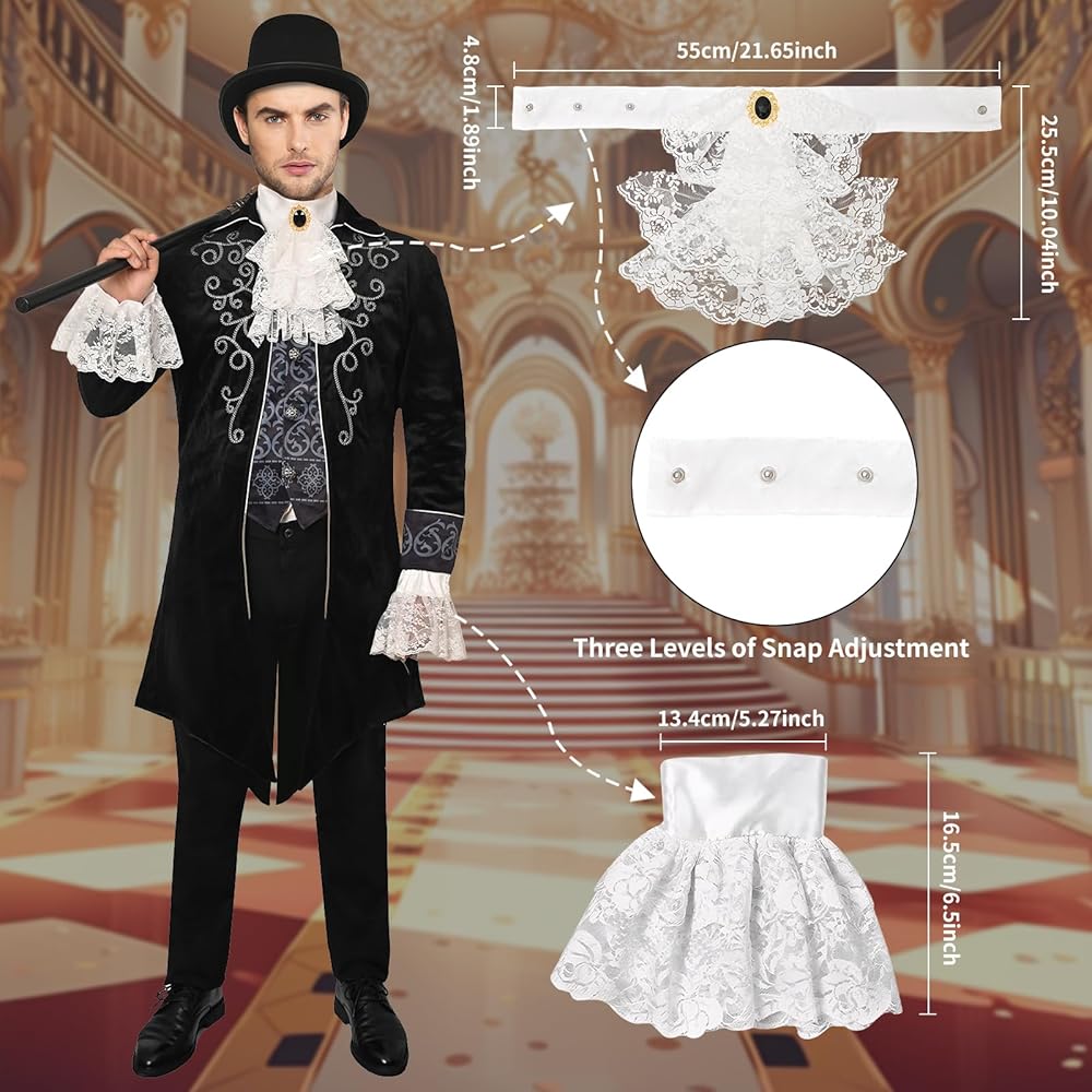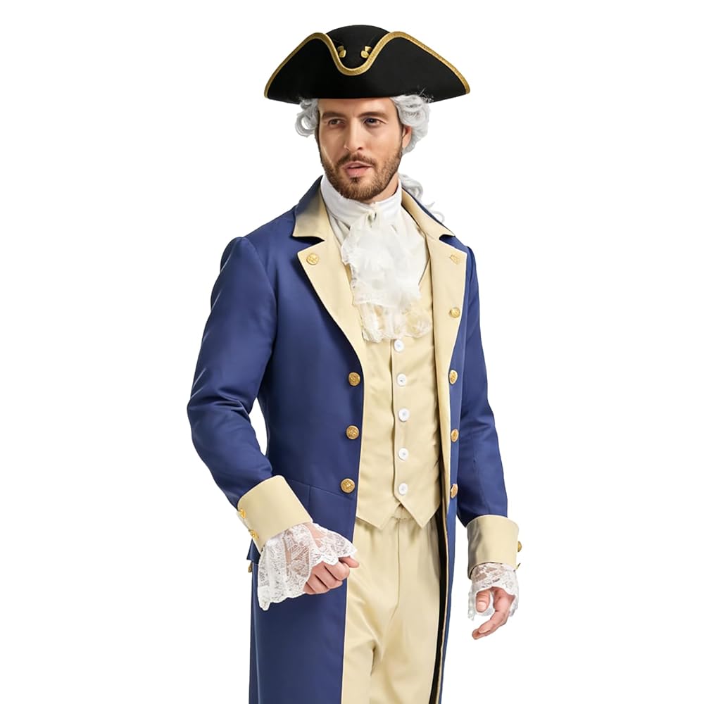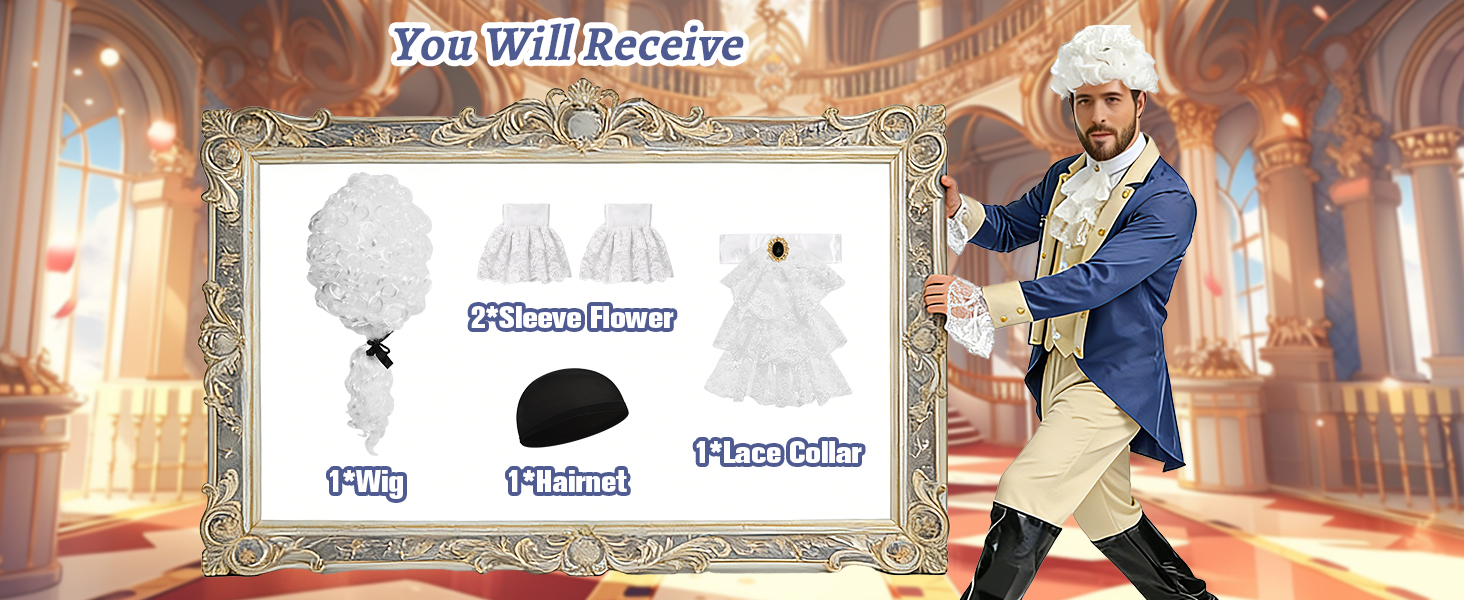تشمل العبوة: تتضمن حزمة الزي شعرًا مستعارًا أبيض، وياقة دانتيل وزوج من أساور القميص مثالية لأي طفل أو بالغ يرتدي فستان المستعمرين الأمريكيين.
