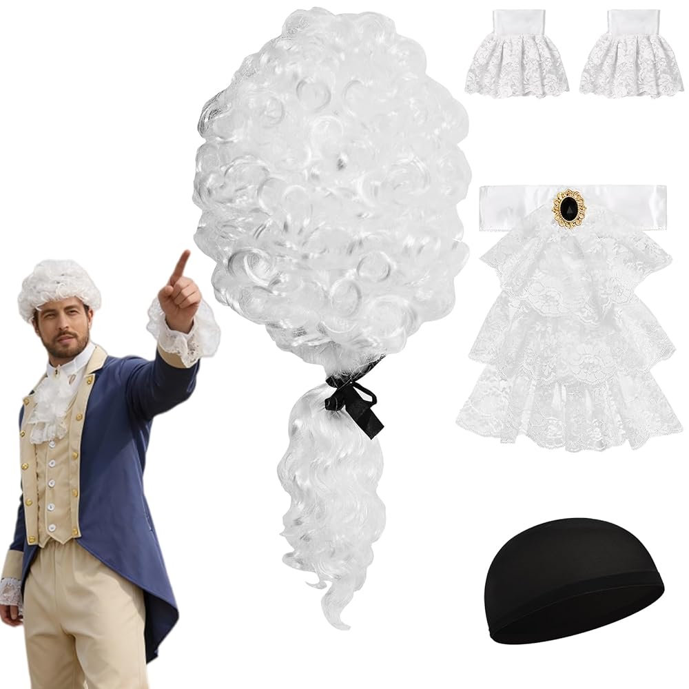 شعر مستعار على الطراز الاستعماري من GYQMBT، إكسسوارات أزياء الآباء المؤسسين، مجموعة شعر مستعار للقاضي مع ربطة عنق من الدانتيل وأساور أكمام من الدانتيل.