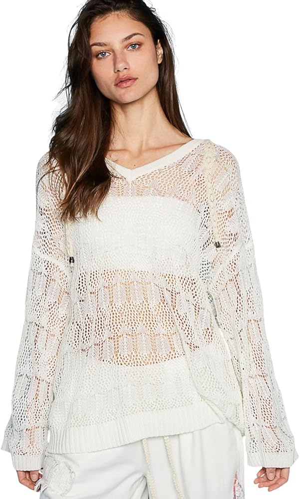 Elevate your casual wardrobe with this stunning white crochet knit sweater from POL. This beautifully crafted piece features an intricate open stitch pattern throughout, creating an ethereal, lacy appearance that's perfect for layering. The long sleeves and relaxed silhouette offer both comfort and style, while the V-neckline adds a feminine touch. The sweater's semi-sheer design makes it versatile enough to wear over a camisole or as a lightweight layer. The ribbed cuffs and hem provide structure to the flowing silhouette, while the quality knit construction ensures durability. This sweater pairs perfectly with everything from casual denim to dressy slacks, making it a versatile addition to your wardrobe. The classic white color maintains its timeless appeal throughout any season. Whether dressed up or down, this POL sweater offers the perfect blend of sophistication and casual comfort.