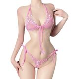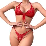💋💋💋This two-piece lingerie set blends sheer mesh with delicate floral embroidered lace to create an elegant yet seductive silhouette. The halter triangle bra provides light shaping while its ultra-thin mesh highlights your natural curves beautifully.