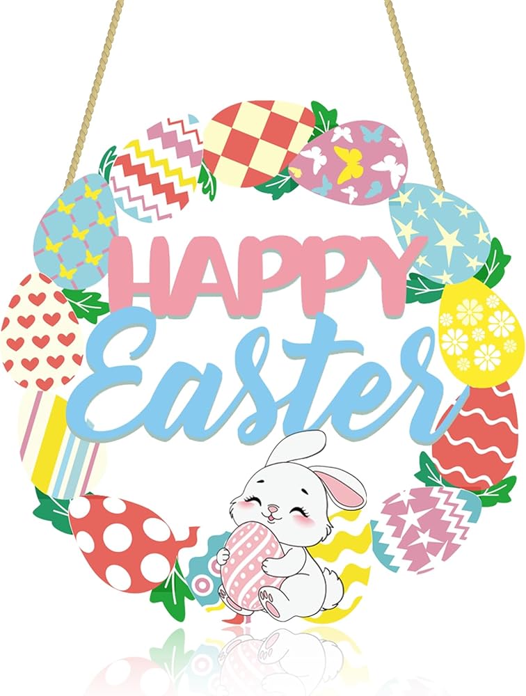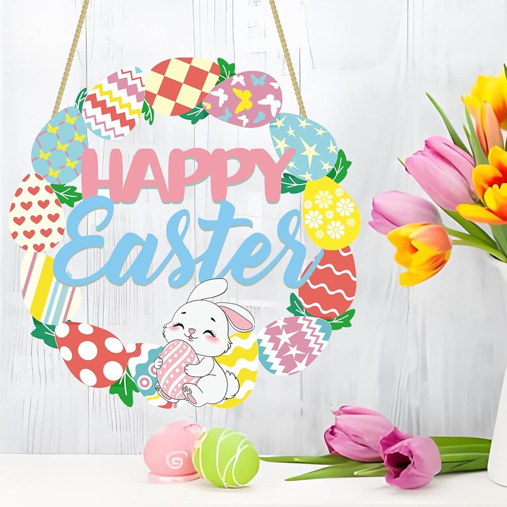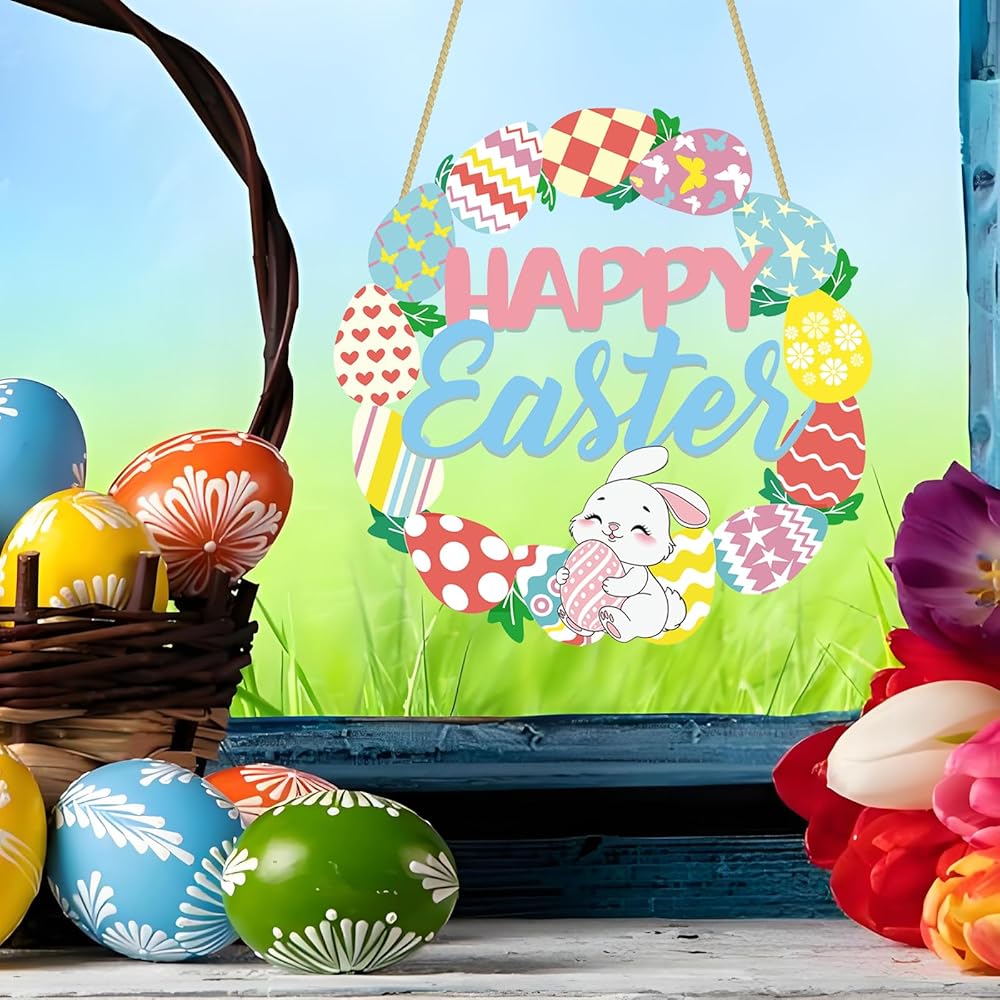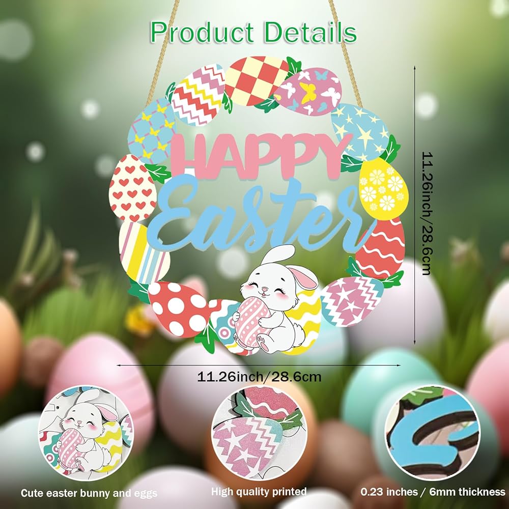 Happy Easter Sign Door Decorations: The package comes with 1 wooden 11" Easter bunny eggs sign with hanging rope. The wood wreath easter sign is printed in spring colors, with light green 'Happy Easter' words printed. Bringing you the breath of spring.