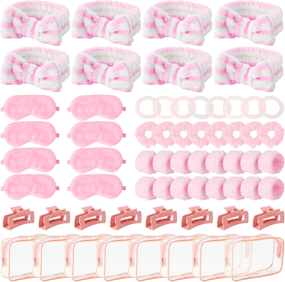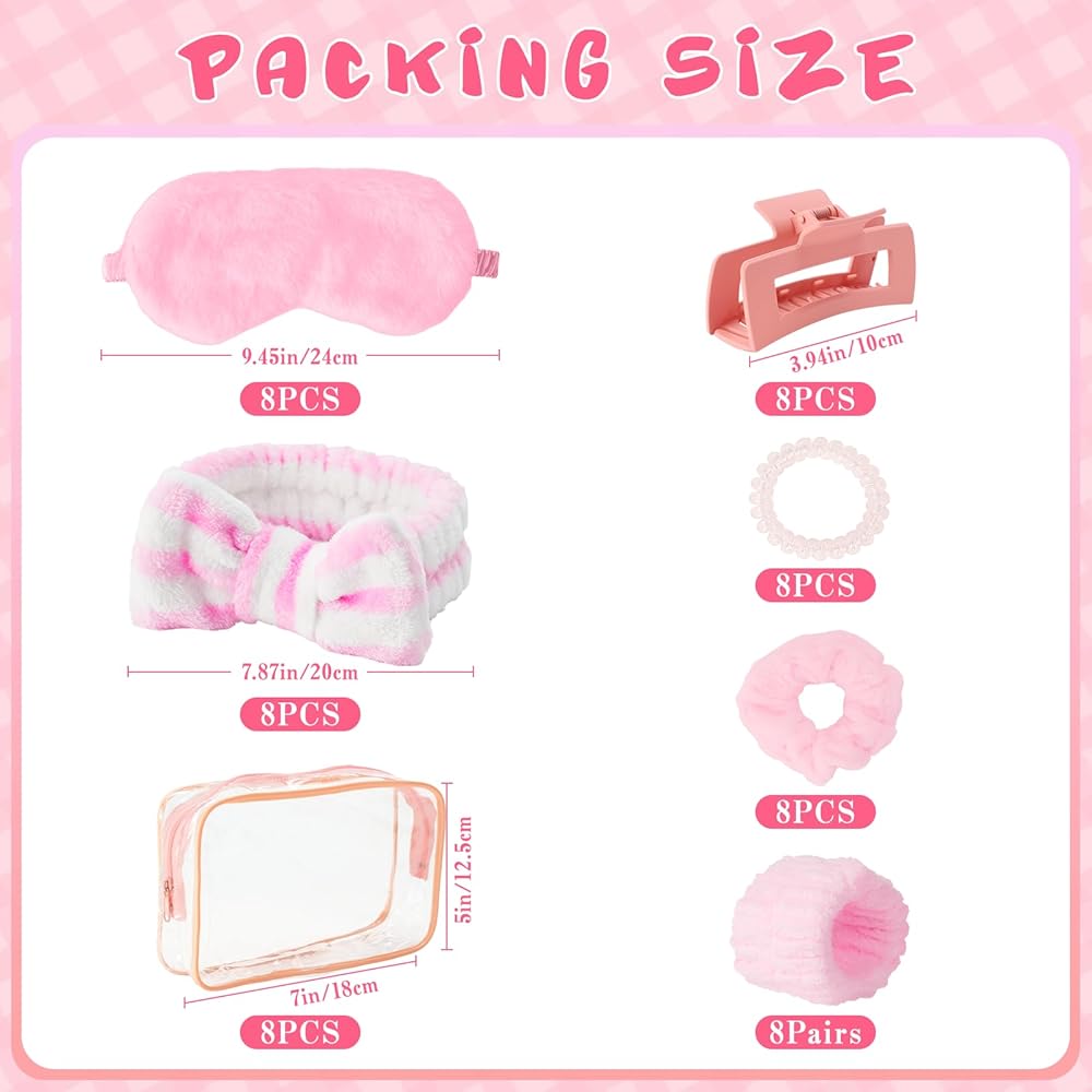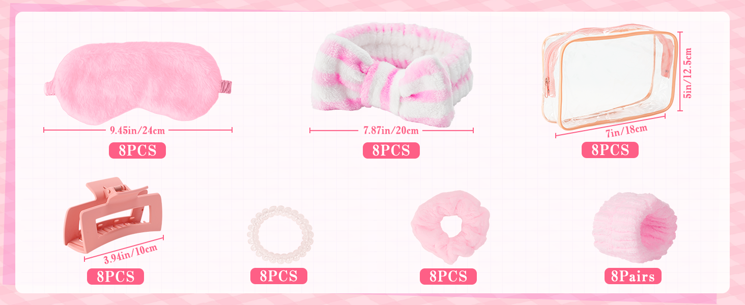 • مجموعة هدايا حفلات السبا: سوف تحصل على إجمالي 64 قطعة من مستلزمات حفلات السبا للفتيات. تتضمن 8 عصابات رأس، 8 أقنعة للعين، 8 ربطات شعر مخملية، 8 ربطات شعر ملفوفة، 8 مشابك شعر، 8 أزواج من أساور المعصم، و8 حقائب شفافة. كمية كبيرة يمكنك مشاركتها وارتدائها مع أصدقائك، مثالية ليوم المنتجع الصحي أو الحفلات.