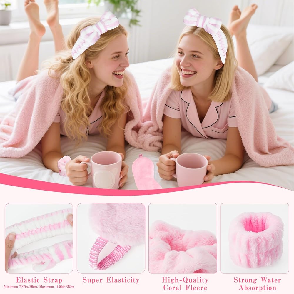 • مادة ناعمة ومريحة: عصابات رأس السبا وأربطة الشعر وأقنعة العين وأساور المعصم مصنوعة من الصوف المرجاني؛ ناعم ومريح، بدون رائحة، ليس من السهل أن يبهت، وعالي الامتصاص. حقيبة مستحضرات التجميل مصنوعة من مادة PVC الشفافة المقاومة للماء ويمكنها استيعاب مستلزمات حفلات البيجامة هذه.