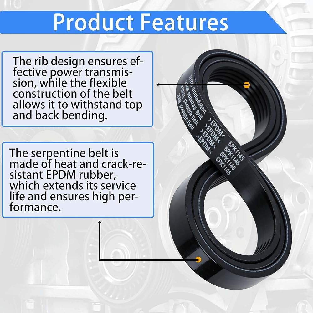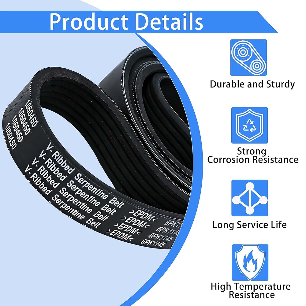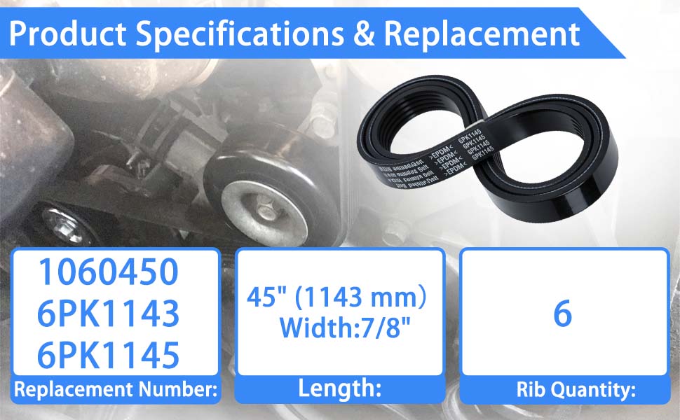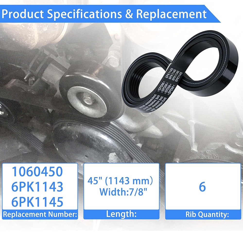 المواصفات: حزام أفعواني ذو 6 أضلاع بطول 45 بوصة (1143 ملم). تتضمن أرقام الأجزاء البديلة 1060450、6PK1145 و6PK1143