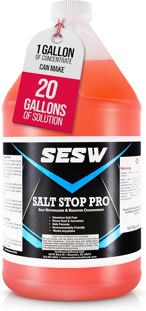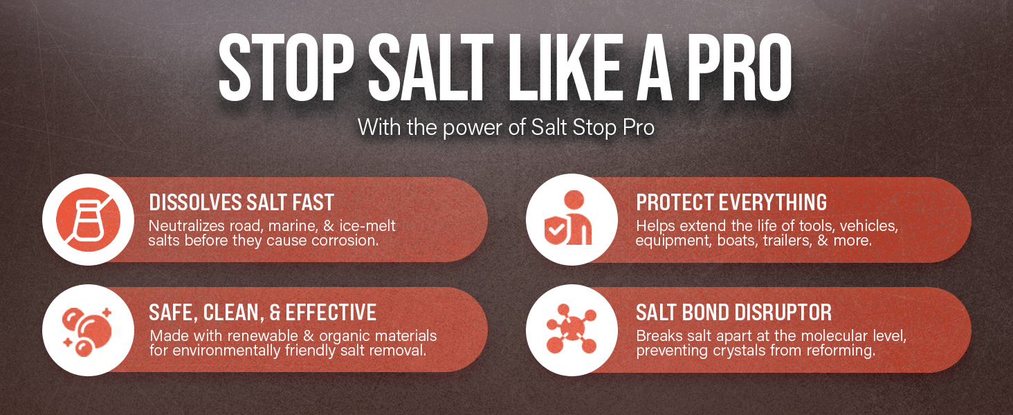 امسح أضرار الملح - يعمل Salt Stop Pro على إزالة الملح المتآكل بسهولة، مما يساعد على تحييد أي شيء متبقي على الأسطح الصلبة والقوارب والمعدات والأدوات والمقطورات.