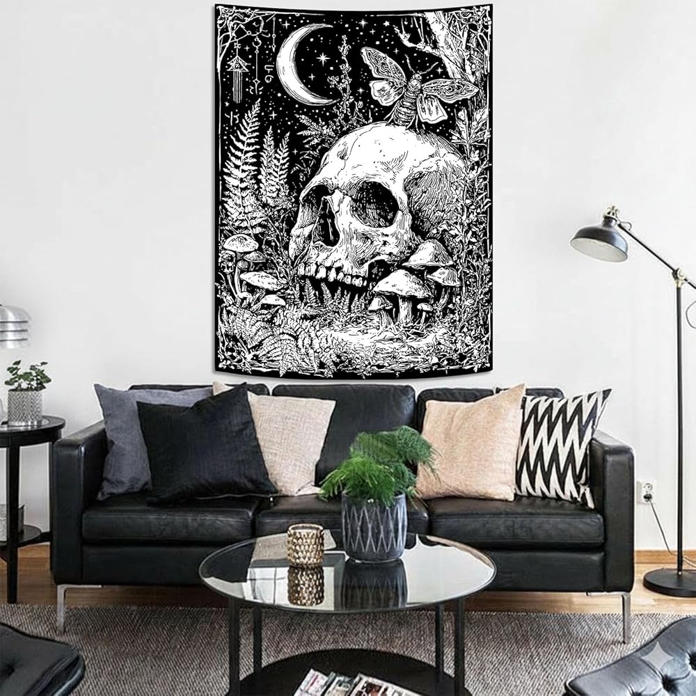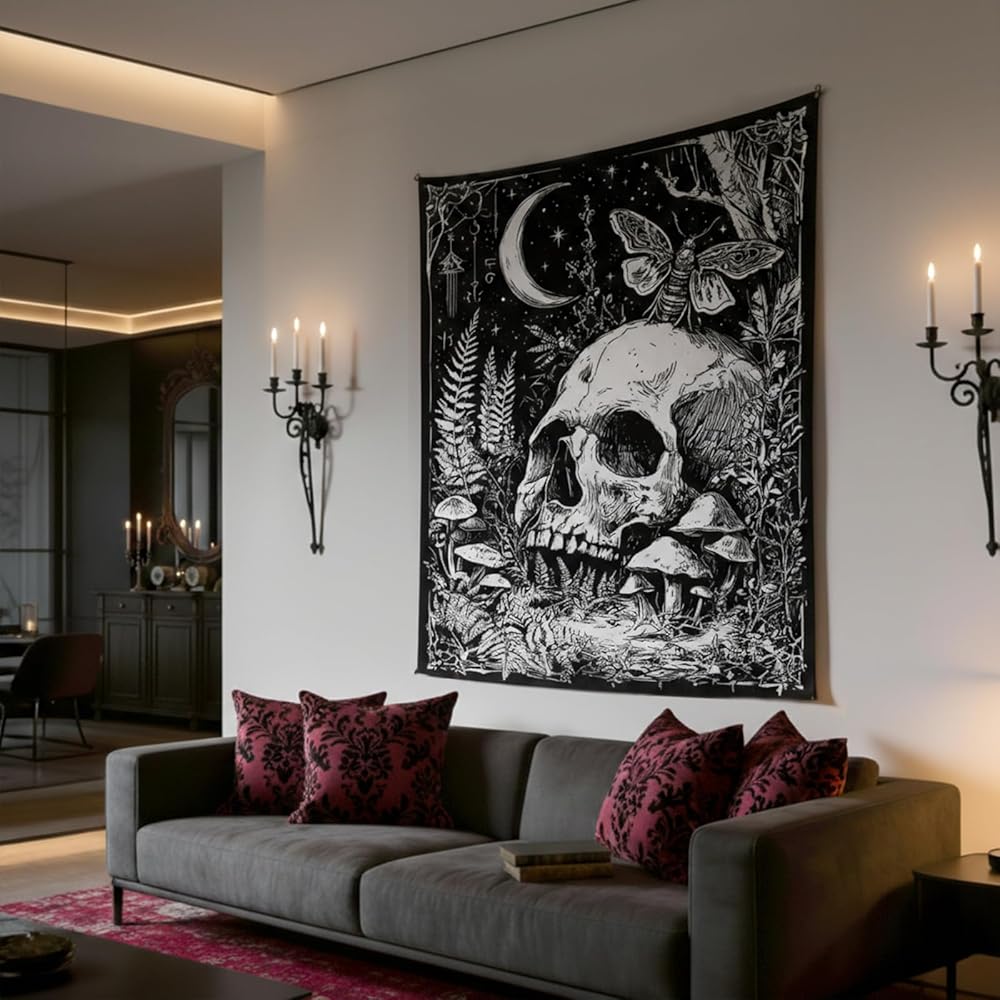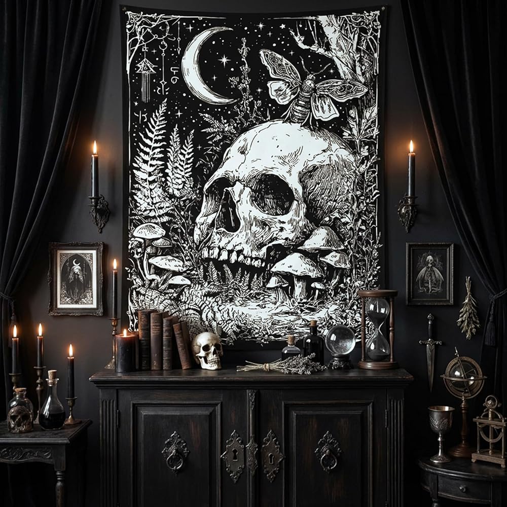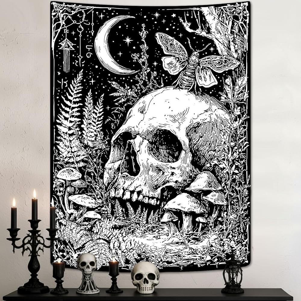【تصميم طبيعي قوطي فريد من نوعه】 يتميز هذا النسيج العمودي المذهل بجمجمة مهيبة وسط الفطر والسراخس، وتعلوها فراشة تحت هلال القمر. مزيج من عناصر الرعب والنباتات والغرونج يخلق نقطة محورية جمالية قوية لأي غرفة.