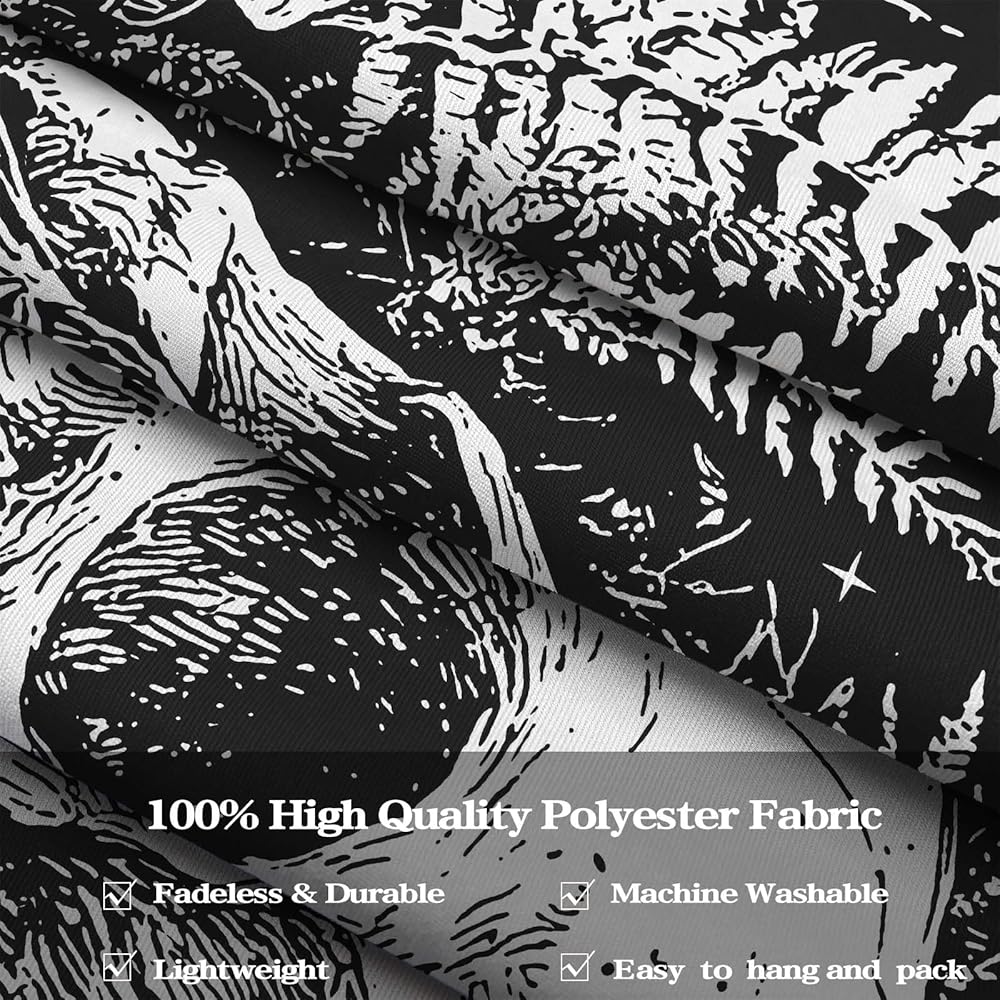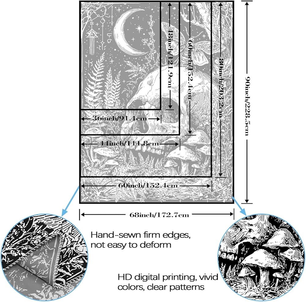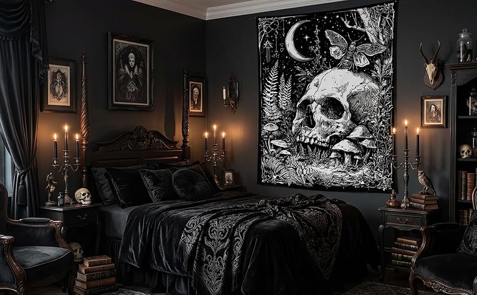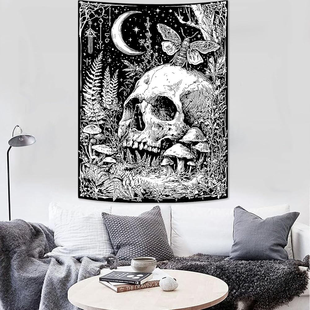 【تصميم طبيعي قوطي فريد من نوعه】 يتميز هذا النسيج العمودي المذهل بجمجمة مهيبة وسط الفطر والسراخس، وتعلوها فراشة تحت هلال القمر. مزيج من عناصر الرعب والنباتات والغرونج يخلق نقطة محورية جمالية قوية لأي غرفة.