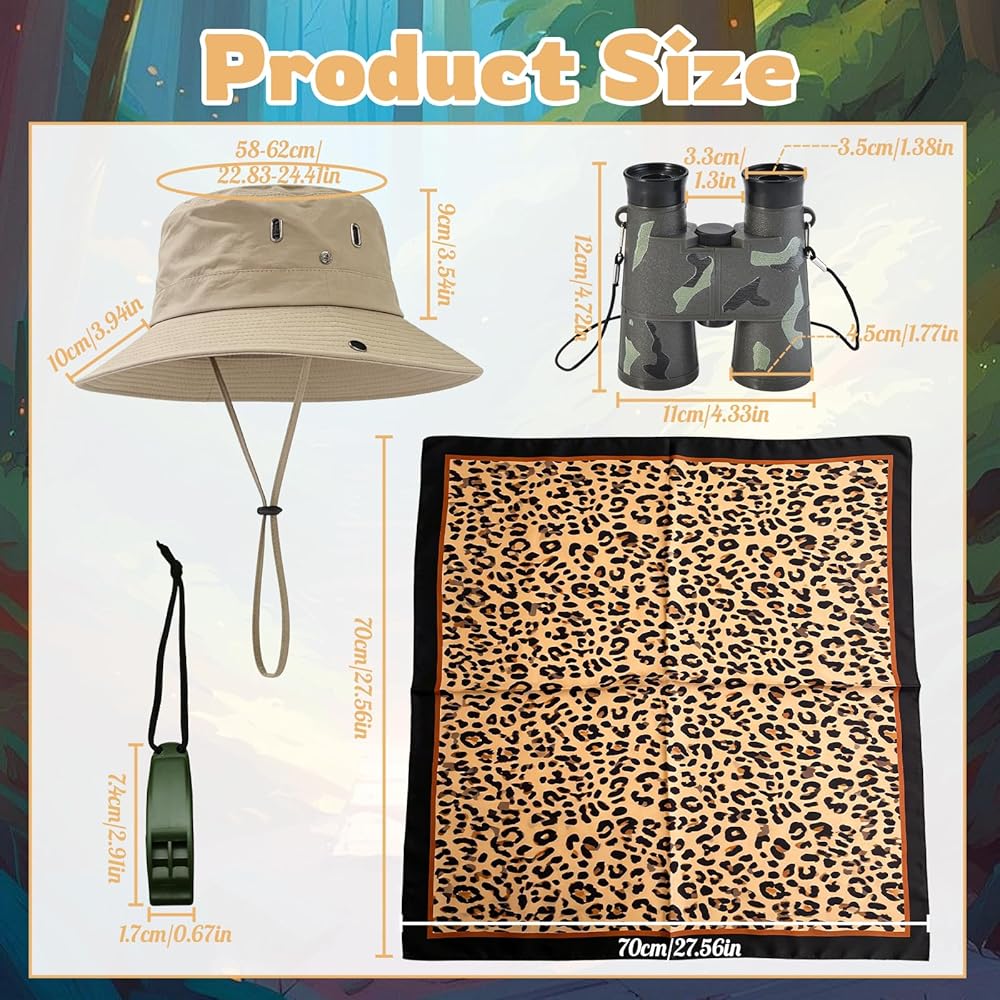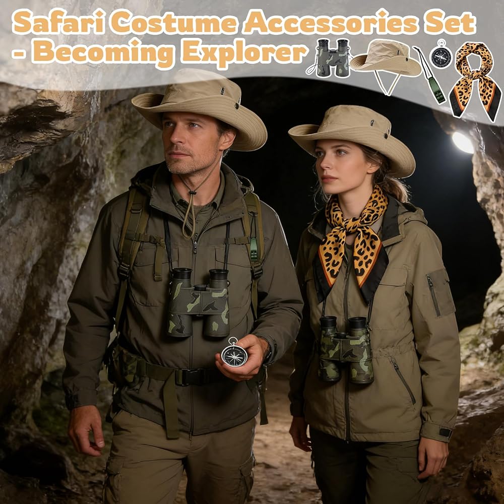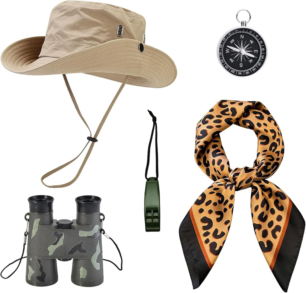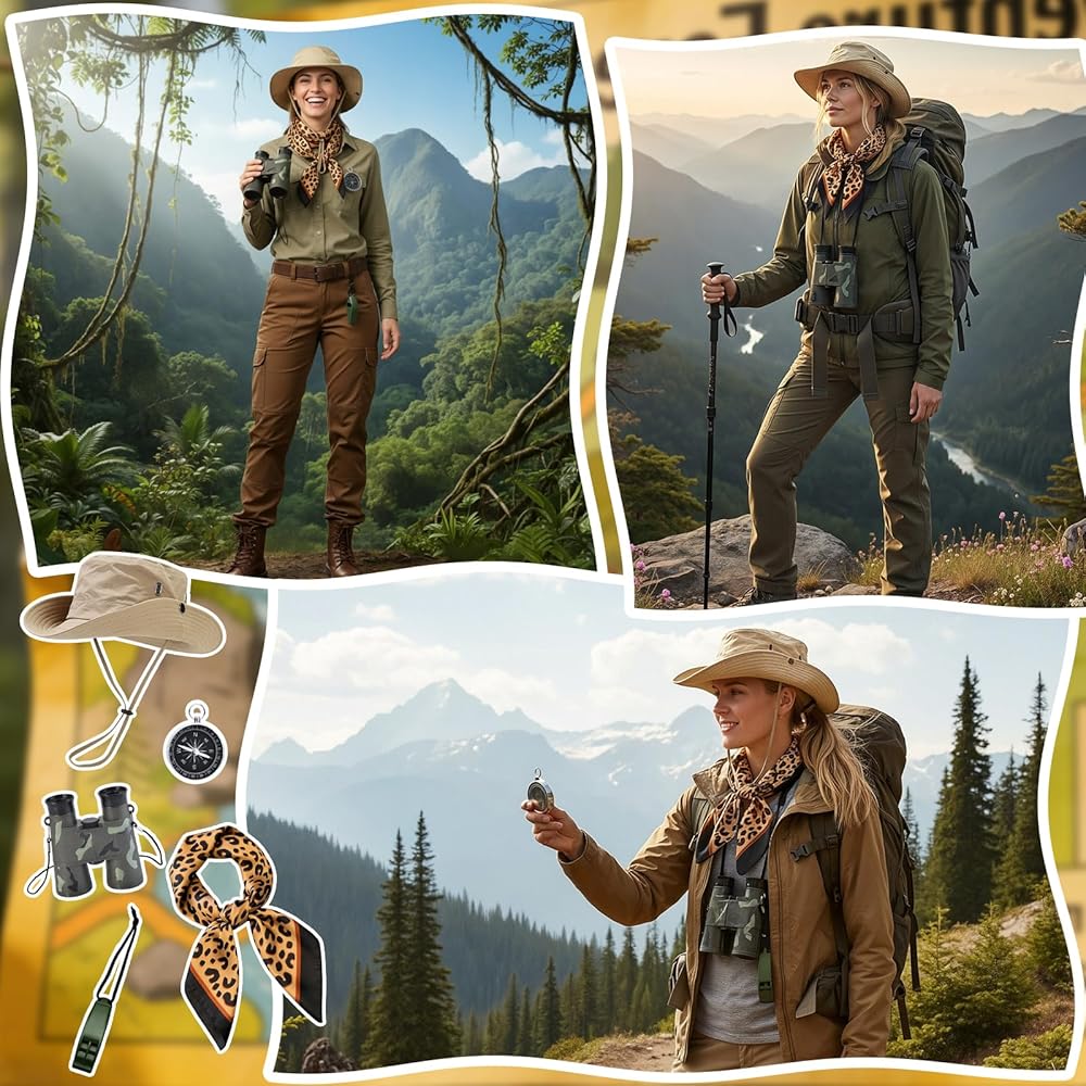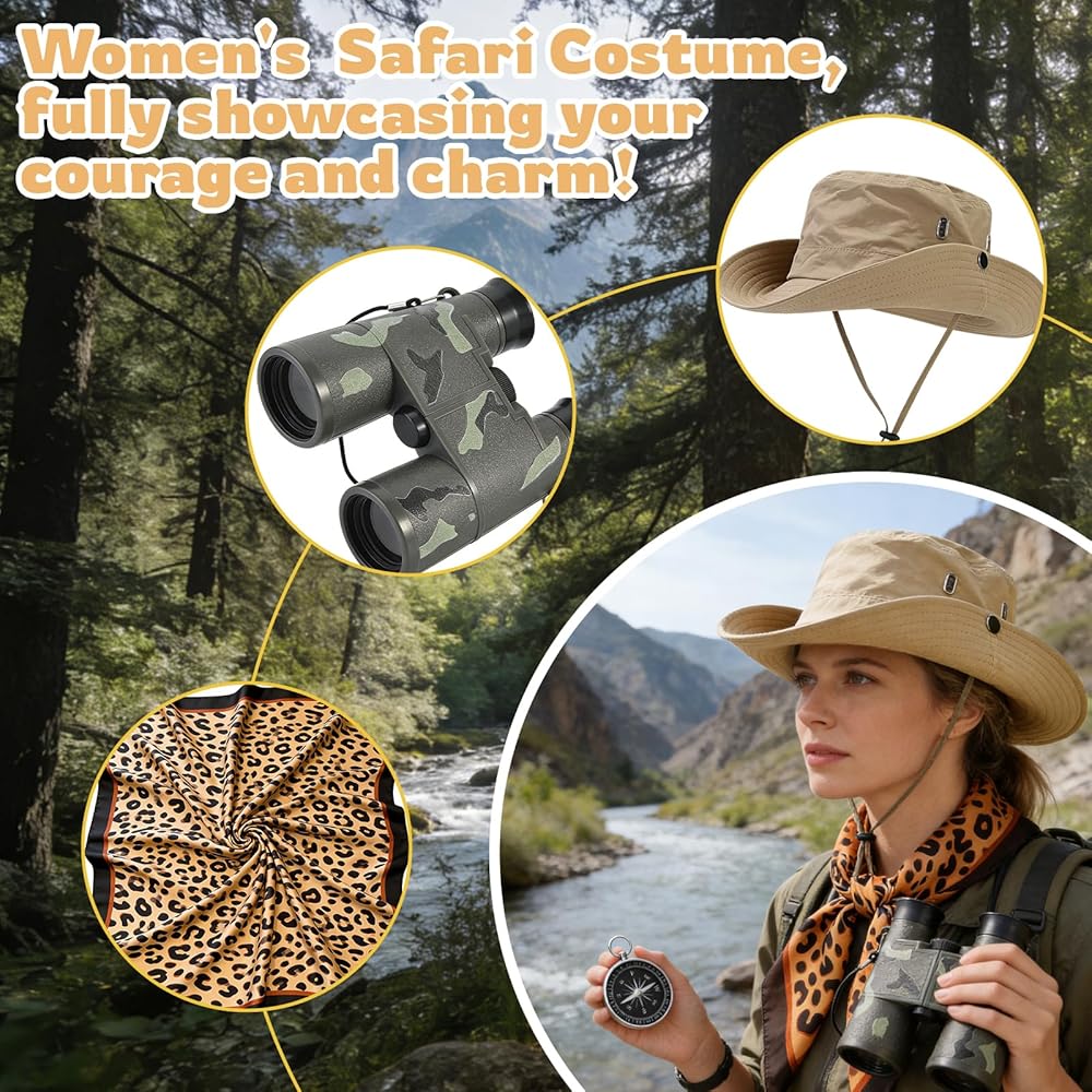 1. Women Safari Costume Complete 5-Piece Explorer Outfit Set: Unleash your adventurous spirit with this complete women's safari costume set! Everything you need to transform into a fearless explorer in seconds: a stylish fisherman hat, a vibrant leopard print bandana, practical binoculars, a plastic whistle, and a compass. Perfect for Halloween, themed parties, or any occasion where you want to showcase your wild side.