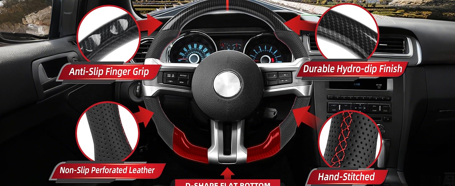 【Aggressive Red Performance Accents】Transform your cabin with a bold Red 12 O'Clock Ring and matching Red Stitching. This color scheme perfectly complements the sporty instrument cluster of the Mustang, replacing the boring, worn-out factory leather wheel with a custom track-ready look.