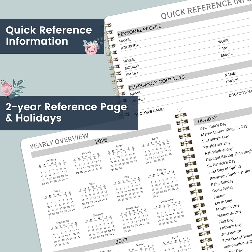 • 🌸 تفاصيل وظيفية - صفحات تخطيط مقاس 8.5 × 11 بوصة + معلومات مرجعية سريعة + صفحات التخطيط المستقبلي + نظرة عامة سنوية 2026-2027 + عطلات 2026-2027 + صفحتان للاتصالات + 1 صفحة ملاحظات + ربط ذهبي قوي بسلك مزدوج + تاريخ جوليان + ورق ممتاز + تصميم غطاء خاص + علامات تبويب ملونة + جيب خلفي.