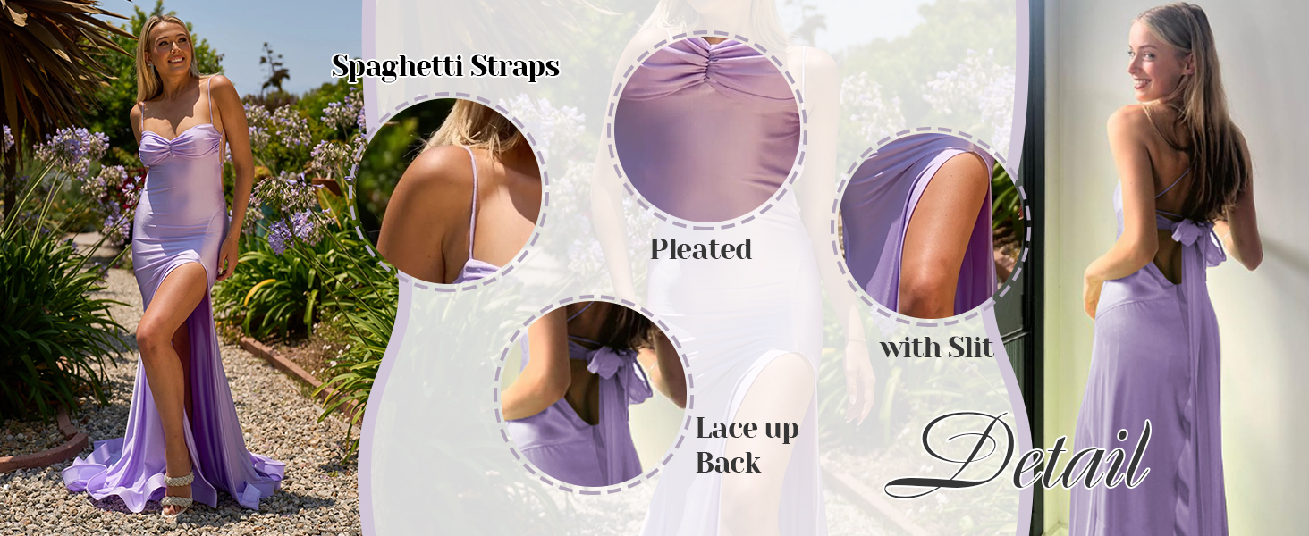 This spaghetti straps dress features backless, spaghetti straps, soft satin, with slit, with bow, pleated/ruched, mermaid, floor length, fully lined, built-in bra, lace up back and soft lining