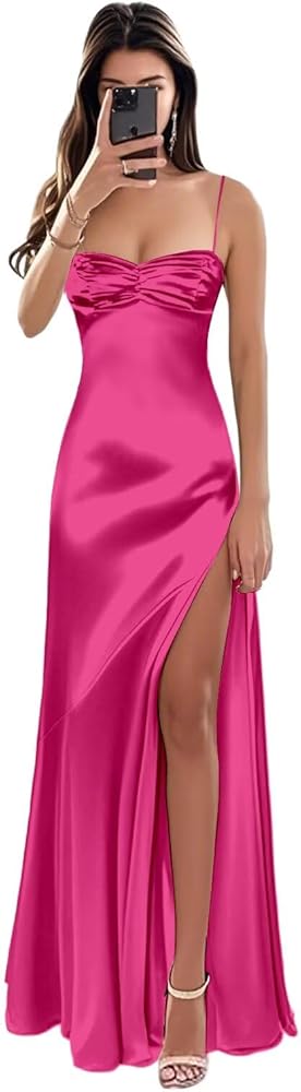 Spaghetti Straps Satin Prom Dresses 2026 for Women, Pleated Backless Prom Dress Long with Bow, Mermaid Satin Prom Party Gown Long for Teens, Elegant Pleated Bow Bridesmaid Dress for Wedding