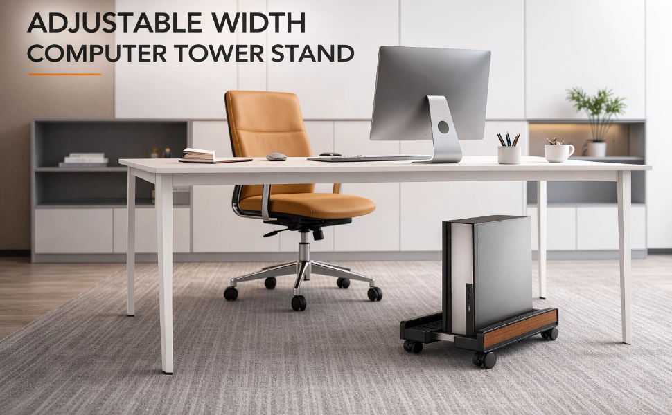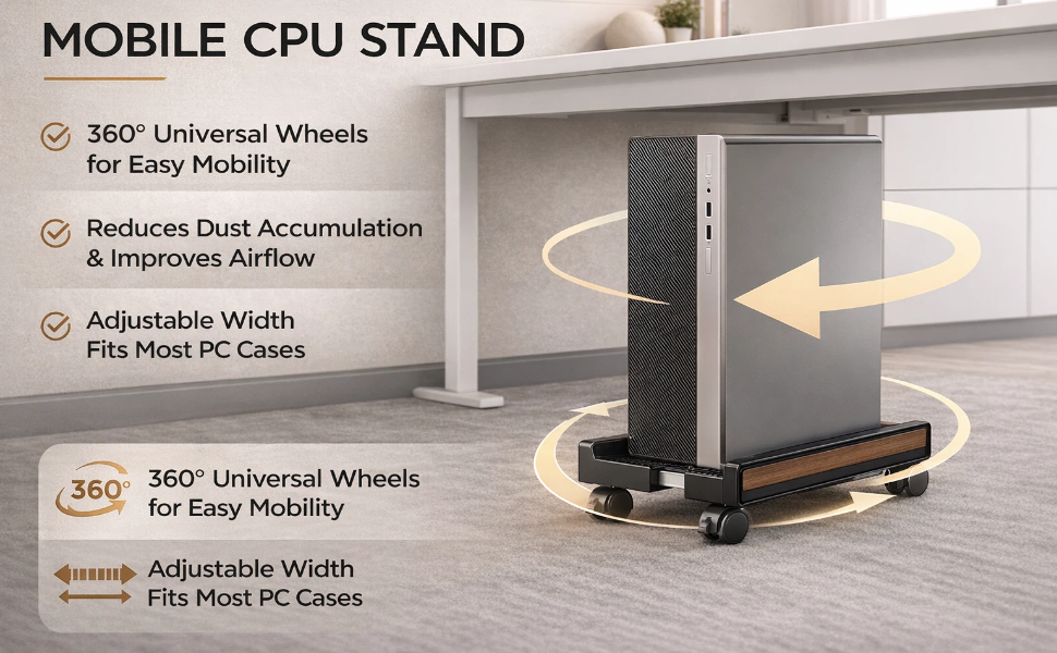 360° Movable Casters with Secure Lock: Equipped with four smooth 360° swivel casters, the stand allows effortless movement of your PC across hardwood floors, tiles and carpets—great for cleaning, cable management or repositioning your device. Two casters are built with a reliable locking system; just press to lock the stand firmly, preventing accidental sliding and ensuring stable placement during use