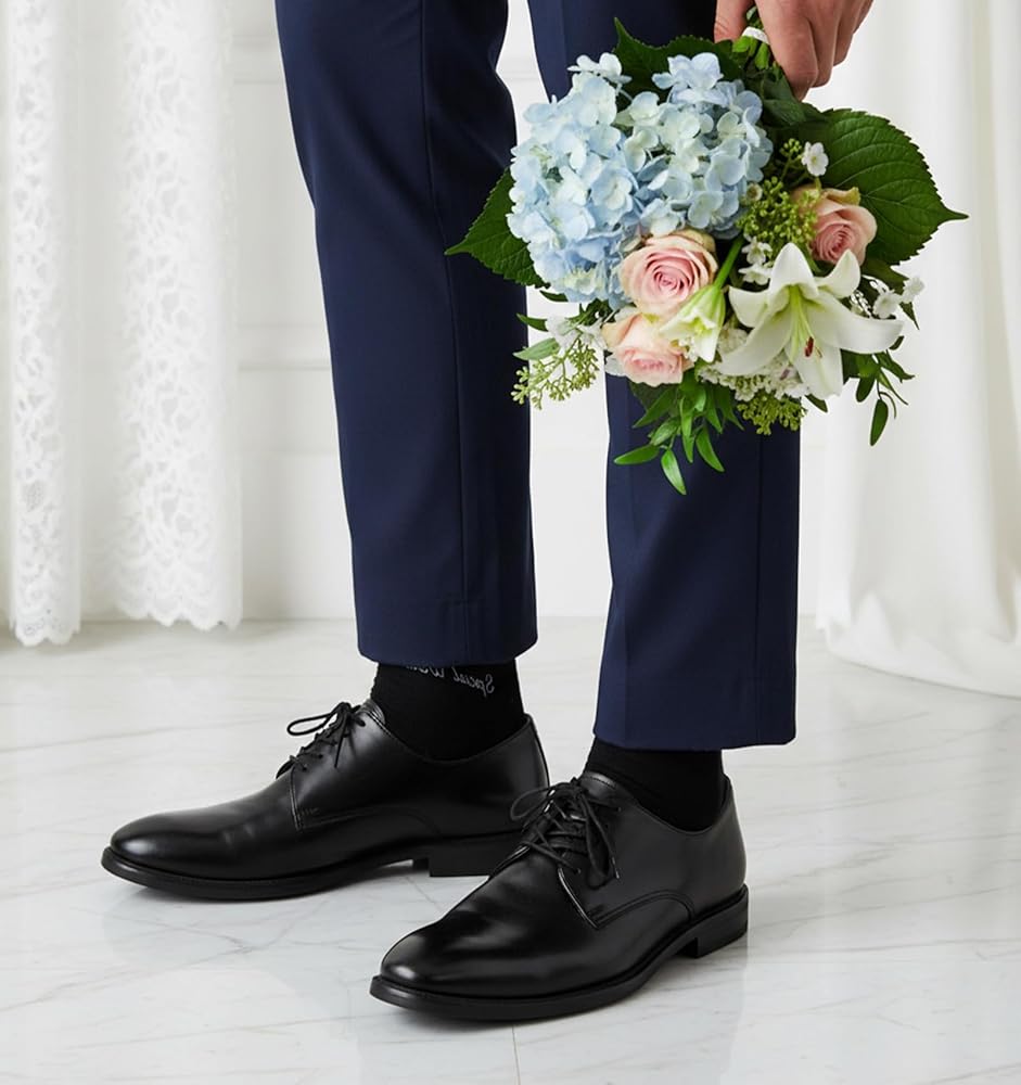 • جوارب والد العروس - تم تصميم جوارب والد العروس لدينا لتناسب معظم الرجال (مقاس الولايات المتحدة 6-13)، مما يوفر خيارًا مريحًا ومساميًا ليومك الخاص