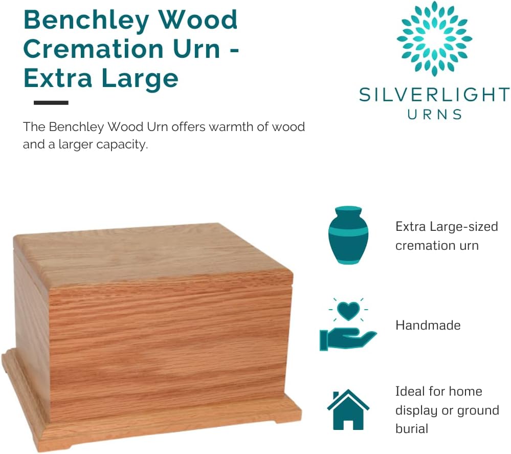 The Benchley Wood Urn for Ashes - Extra Large can honor a loved with its comforting, traditional style. This funeral urn has a box shape, softly rounded edges, and a base for a sturdy look. People appreciate the familiar feel of this urn -- like a wood table in the home that the family gathers around. A few of the craftsmanship details of the Benchley Wood Urn for Ashes - Extra Large include its solid wood construction, its natural (clear) finish, and smooth sides and edges. The base is considered a "footed base" as the bottom edge is notched to create feet on the corners. The inner compartment is easy to access. The bottom panel is removed, ashes placed inside, and panel re-attached with the screws provided. The Benchley Wood Urn for Ashes is categorized as an extra large cremation urn. Its capacity is 230 cubic inches (can hold the ashes of a person who weighed 230 pounds or less prior to cremation).