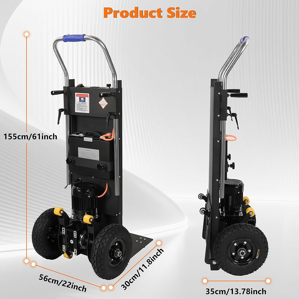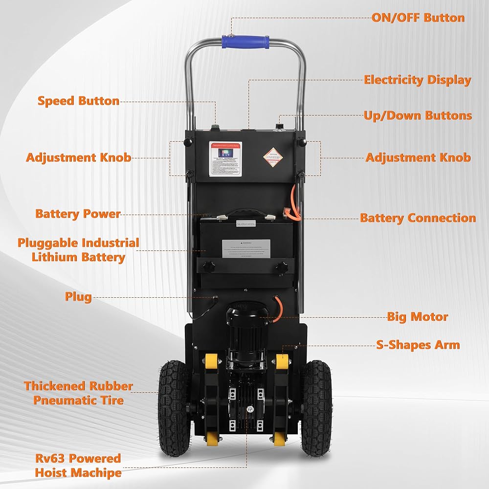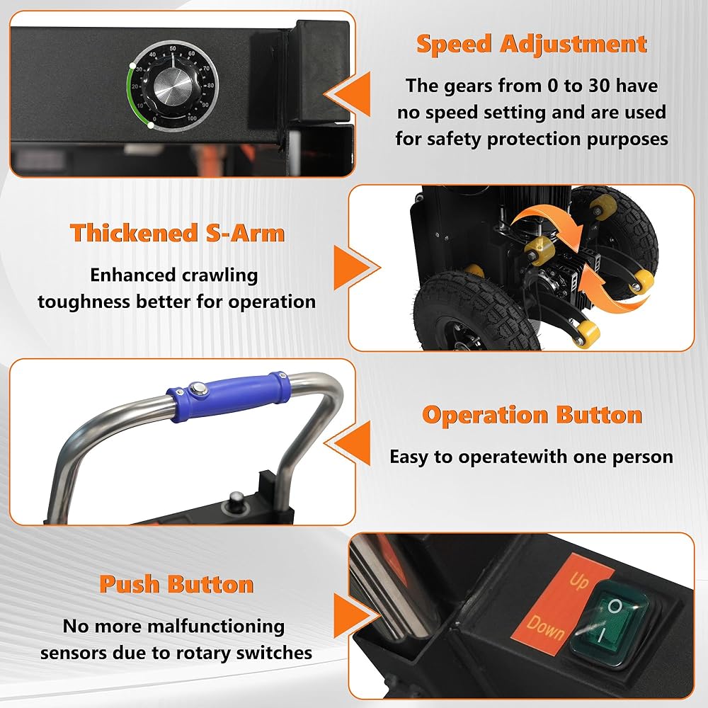 【هيكل متين وشديد التحمل】تم تصميم جهاز تسلق السلالم الكهربائي هذا للمهام الصعبة، ويتميز بهيكل قوي ومتين مصمم للاستخدام طويل الأمد. مصنوعة من مواد عالية الجودة، ويمكنها تحمل بيئات العمل الشاقة بينما تسمح لوحة الأصابع القابلة للطي بالتخزين المريح عند عدم الاستخدام. توفر الإطارات المطاطية غير القابلة للانزلاق احتكاكًا ممتازًا، ويدعم الإطار الفولاذي الصلب أحمالًا تصل إلى 900 رطل من أجل نقل آمن ومستقر.