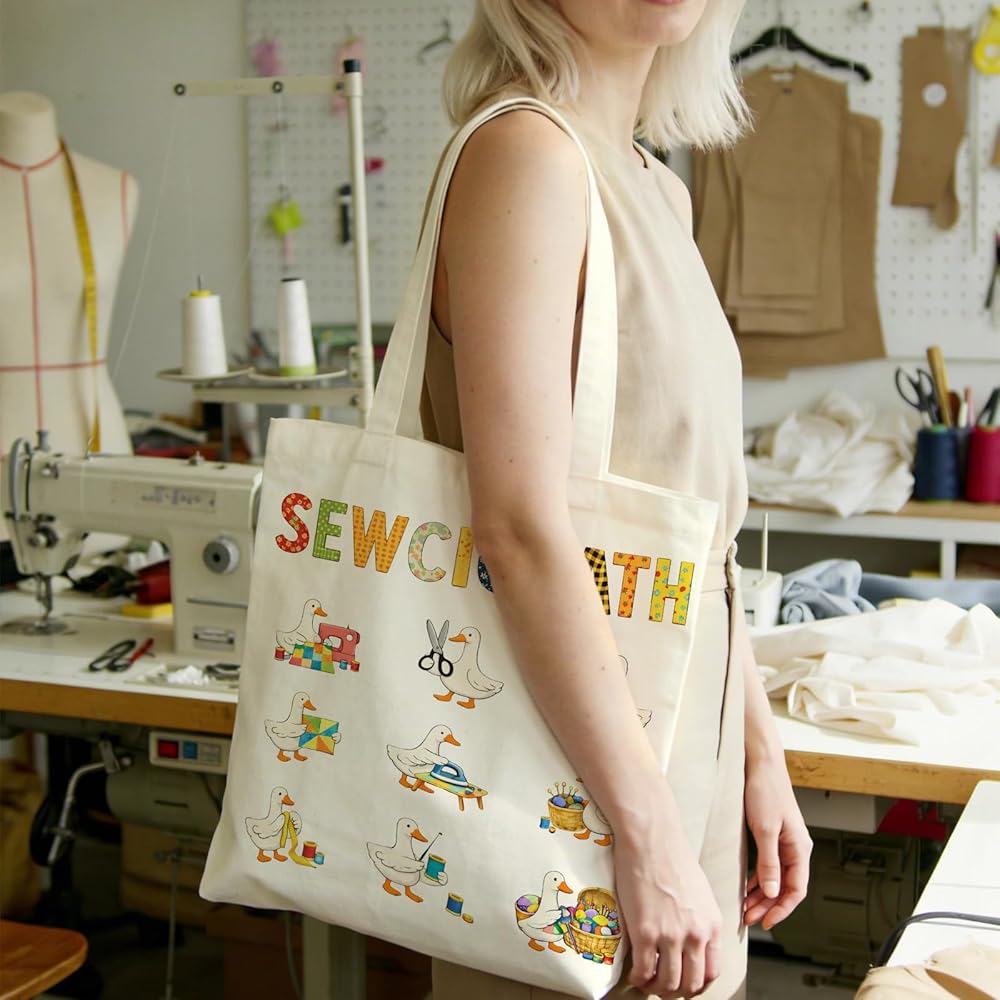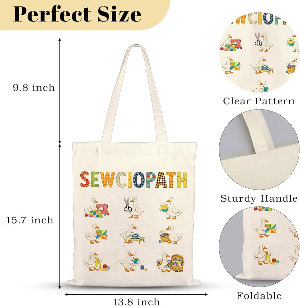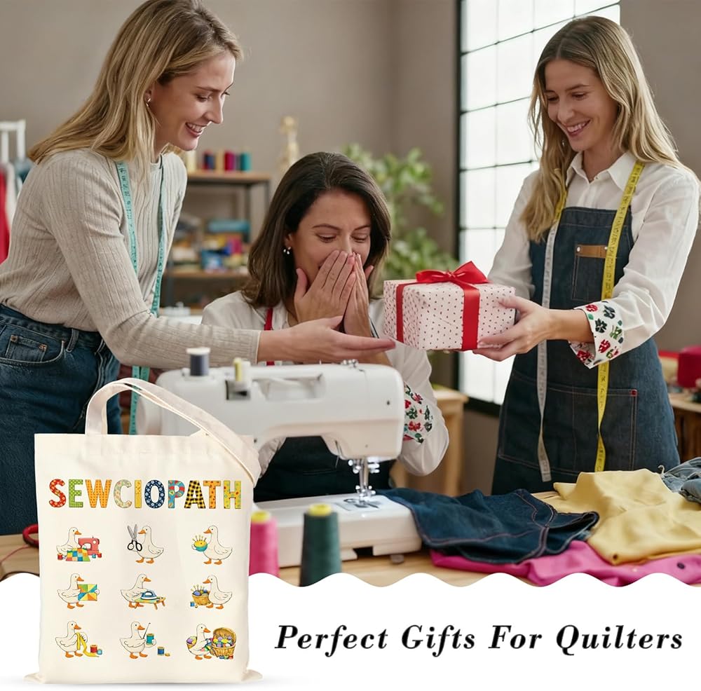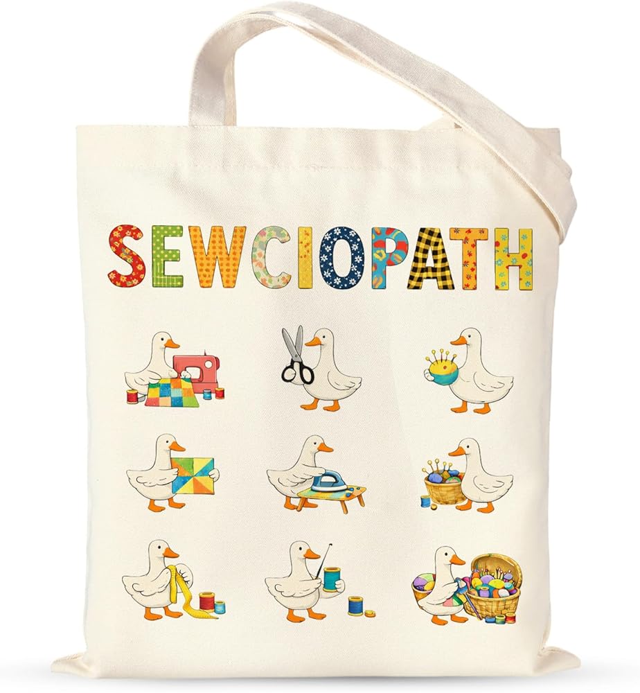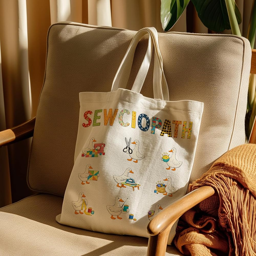 If you know, you know. The term "Sewciopath" isn't just a clever play on words—it's a badge of honor worn proudly by those who measure their happiness in yards of fabric, who dream in thread counts, and whose fabric stash has somehow multiplied overnight. This charming canvas tote is designed specifically for that wonderful, slightly obsessed creator. Adorned with nine whimsical geese and the word that captures their essence, "SEWCIOPATH," it's more than a bag—it's a declaration, a community inside joke, and the perfect companion for every trip to the fabric store, every sewing circle gathering, and every creative adventure in between.