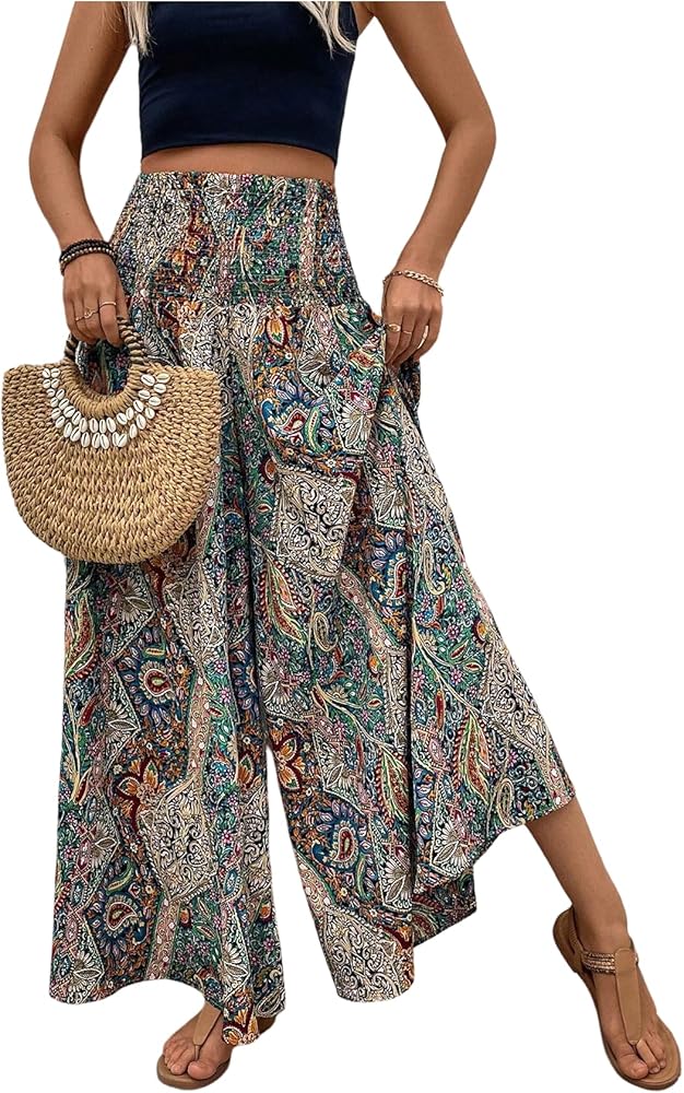 MakeMeChic Women's Boho Palazzo Pants Summer Beach High Waisted Paisley Wide Leg Flowy Trousers in Kuwait