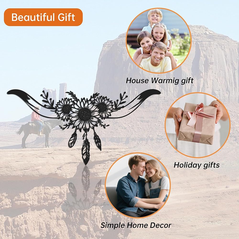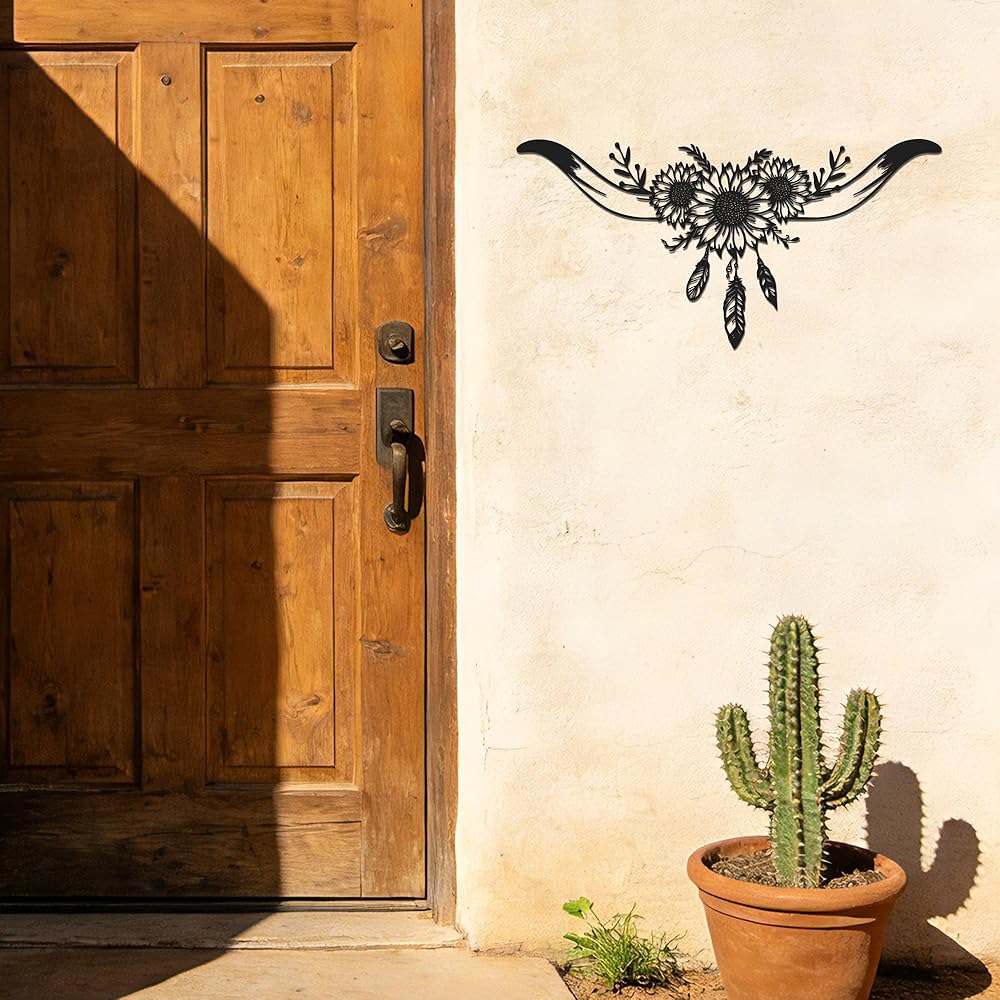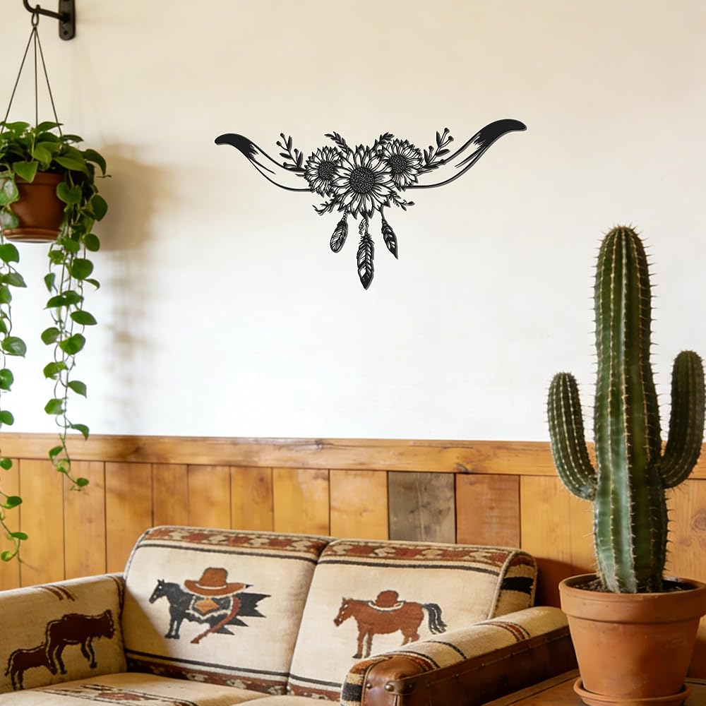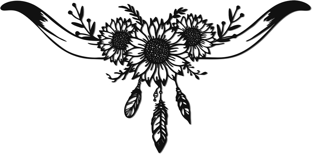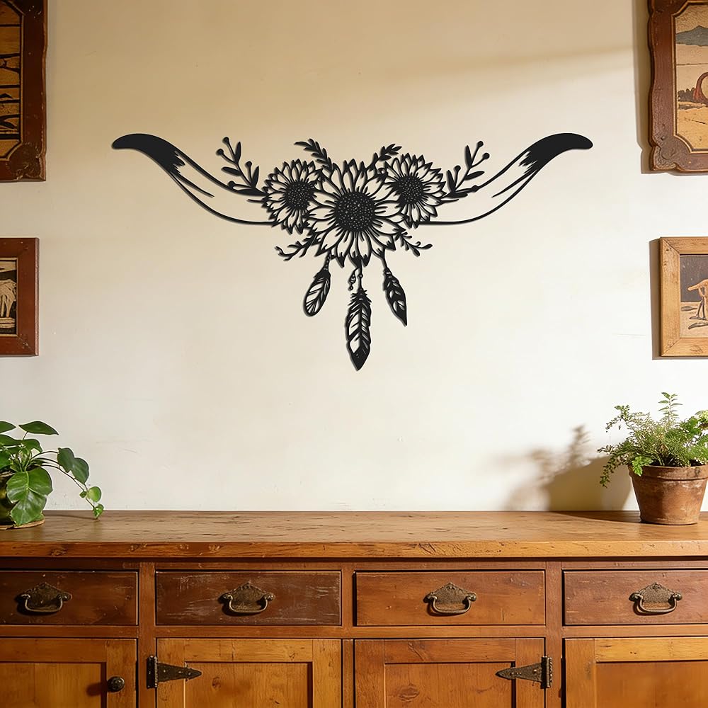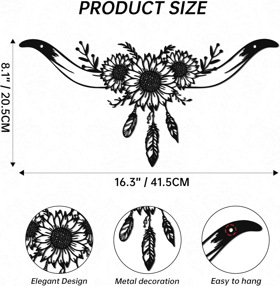 Capture the untamed and adventurous spirit of the Wild West with this stunning Longhorn Skull Metal Wall Art. This intricately designed piece masterfully blends the iconic silhouette of a bull skull with the cheerful beauty of sunflower wall decor and the delicate detail of feathers, creating a unique narrative of rugged beauty and natural harmony. Measuring 8.1" x 16.3", it serves as a bold focal point for any room dedicated to western decor for home.