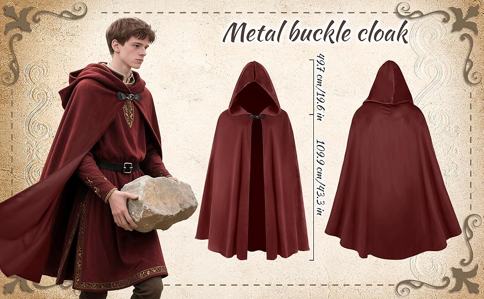• التصميم: عباءة العصور الوسطى بغطاء الرأس، توفر الراحة والأناقة والتغطية الممتازة، وتتميز بمشبك حلقة معدنية لربط الأبازيم الجلدية عند الرقبة، وسهلة الارتداء والخلع، وتحافظ على هذه العباءة المخملية ذات القلنسوة آمنة حولك.