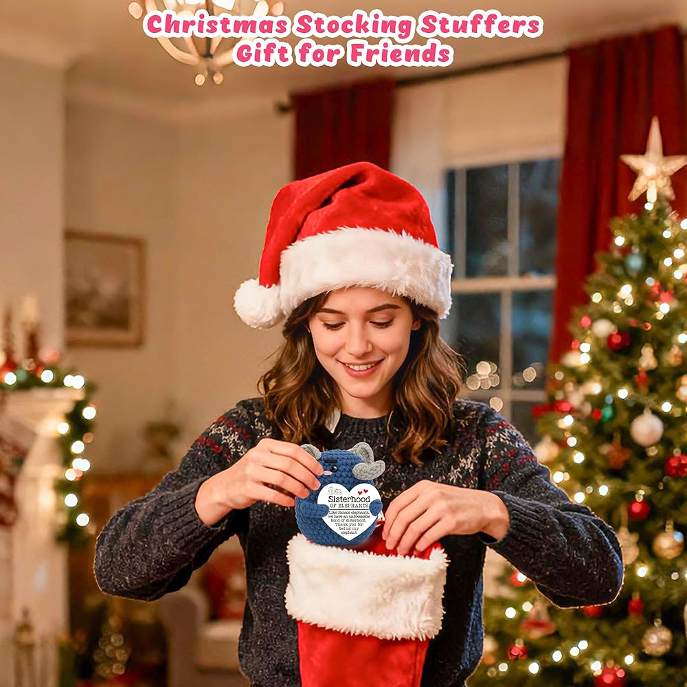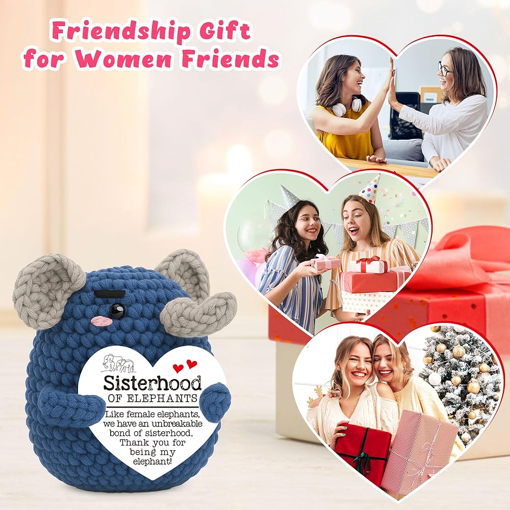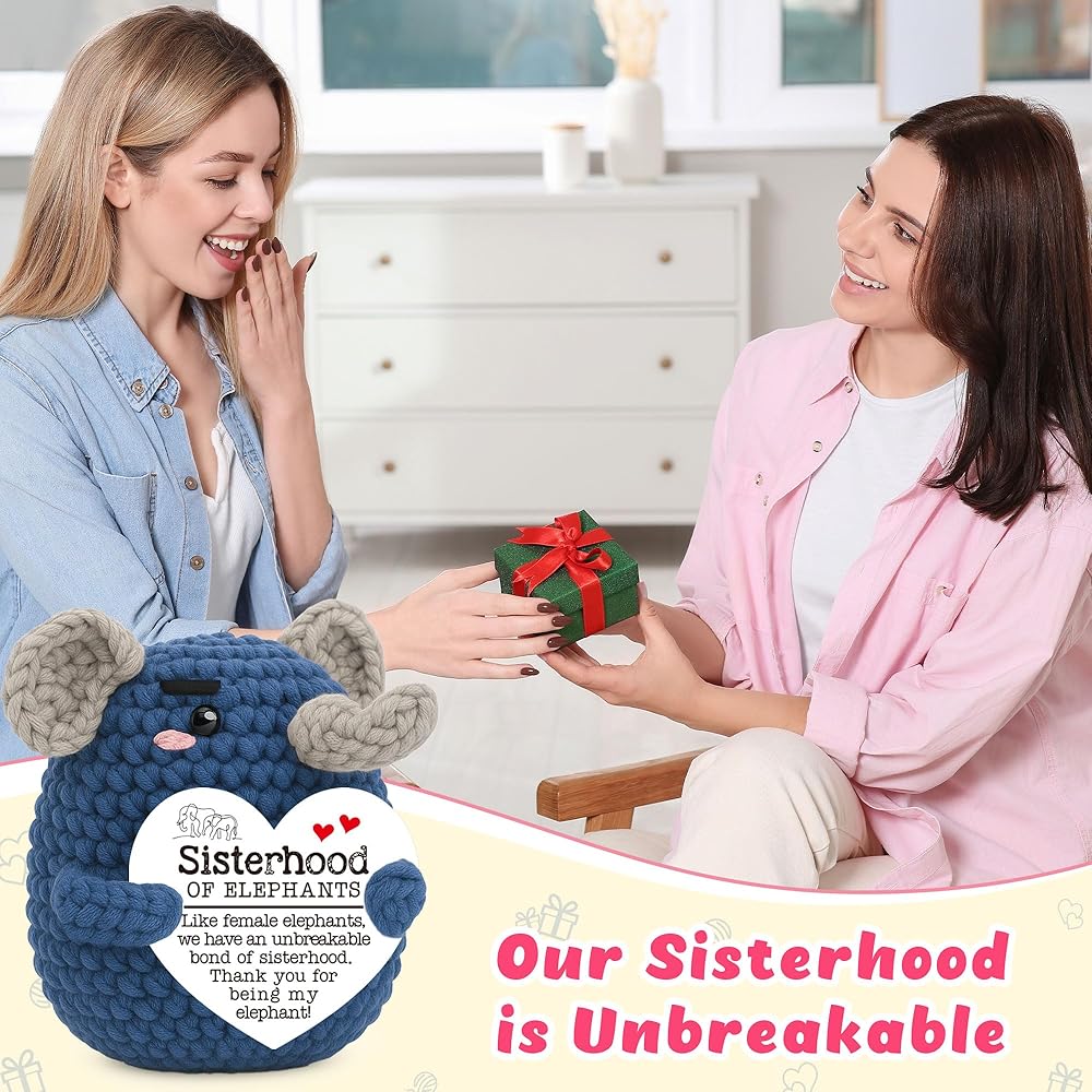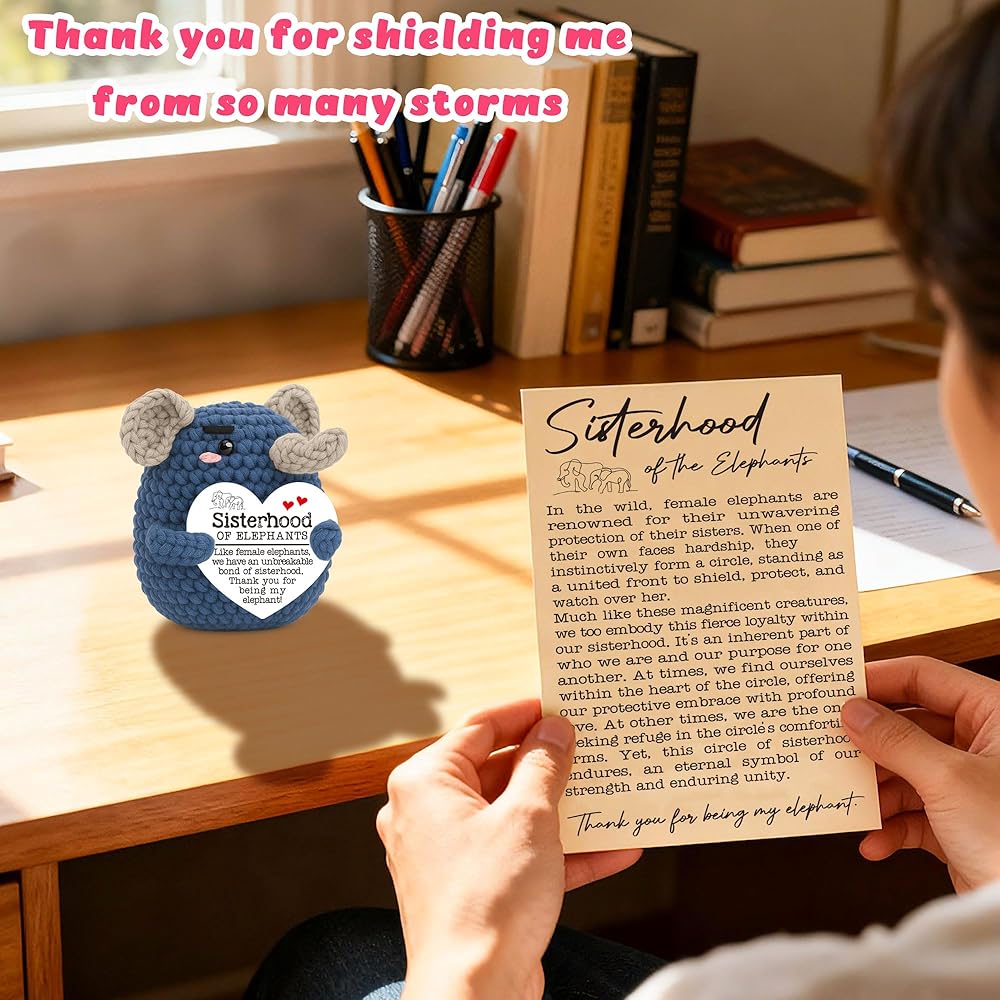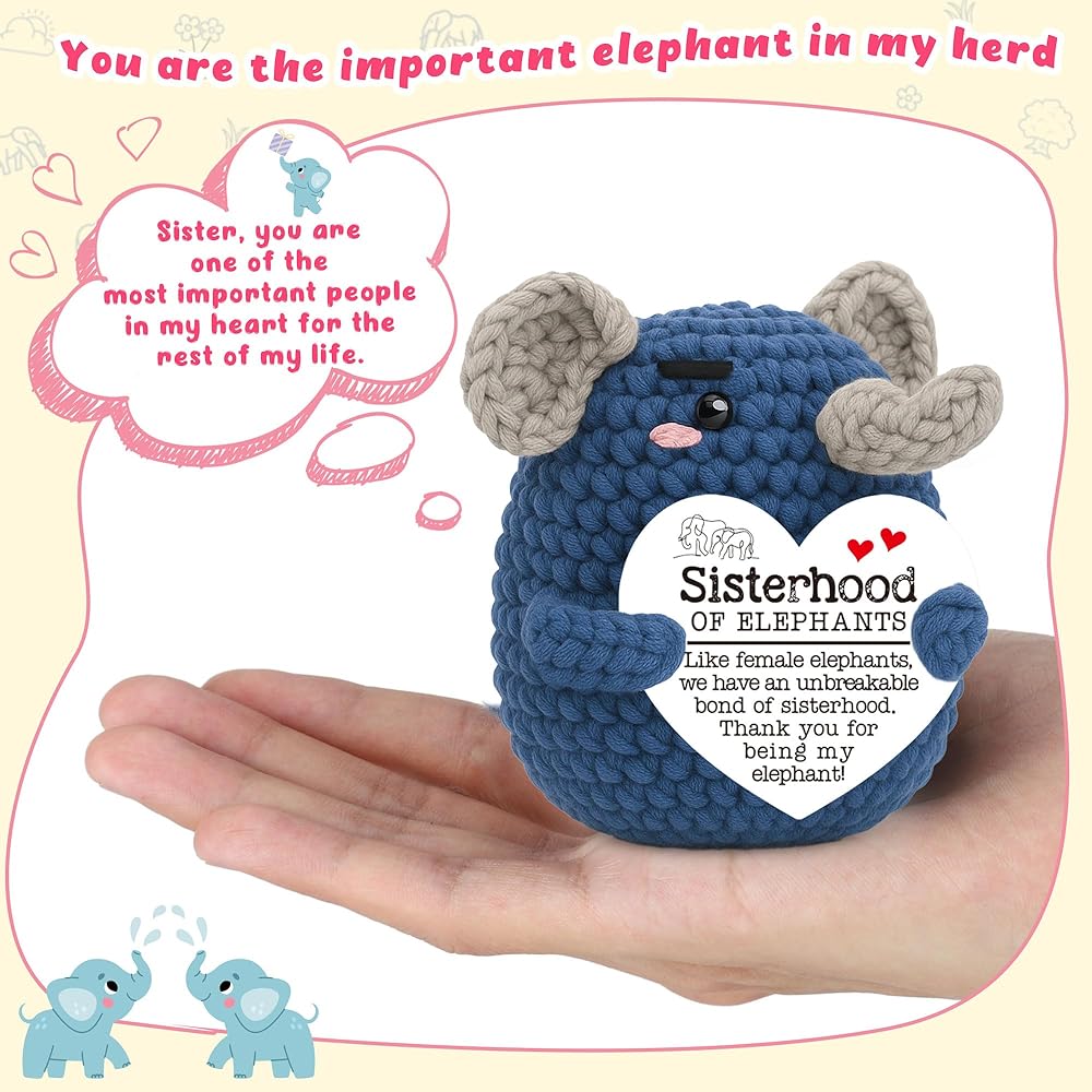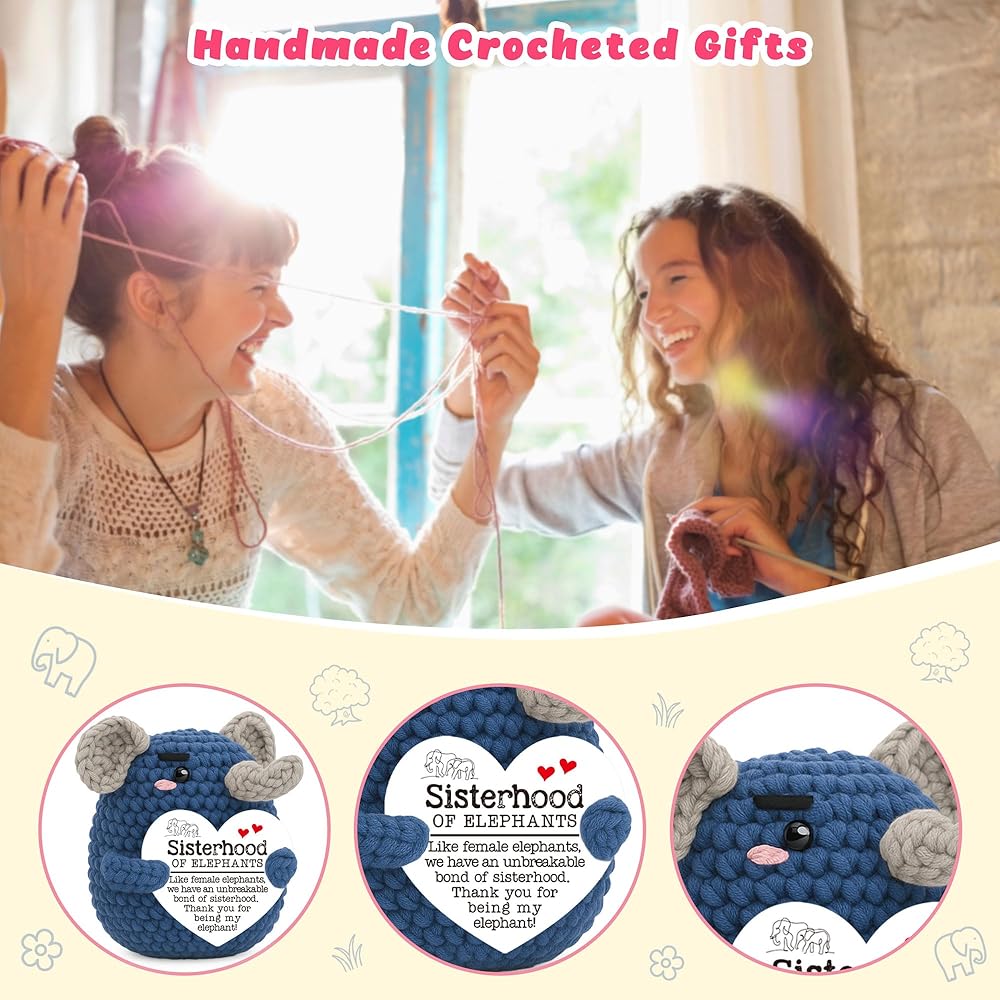 Celebrate the beauty of friendship with this adorable Handmade Crochet Elephant, part of the heartwarming Sisterhood of Elephants collection. Measuring 2.3 x 2.3 x 2.9 inches, this mini elephant is carefully crocheted to symbolize strength, loyalty, and unbreakable bonds—just like true friendship. It's the perfect gift for your best friend, soul sister, or lifelong female friend, whether you're together or miles apart. A meaningful reminder that you're always connected, this charming keepsake makes a thoughtful present for birthdays, holidays, or just to say “I'm thinking of you.” Ideal as a soul sister gift, long-distance friendship gift, or BFF surprise, it's a cute and comforting piece she can place on her desk, shelf, or bedside table. Show your sister by heart how much she means to you with a handmade gift full of love, laughter, and lasting friendship—because sisterhood isn't always about blood, it's about heart.