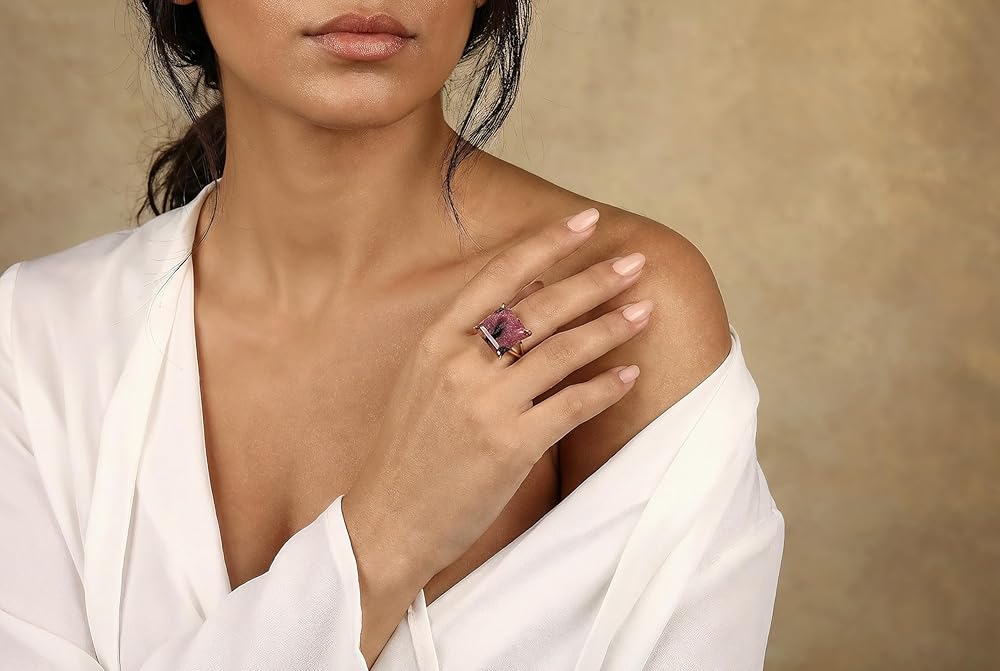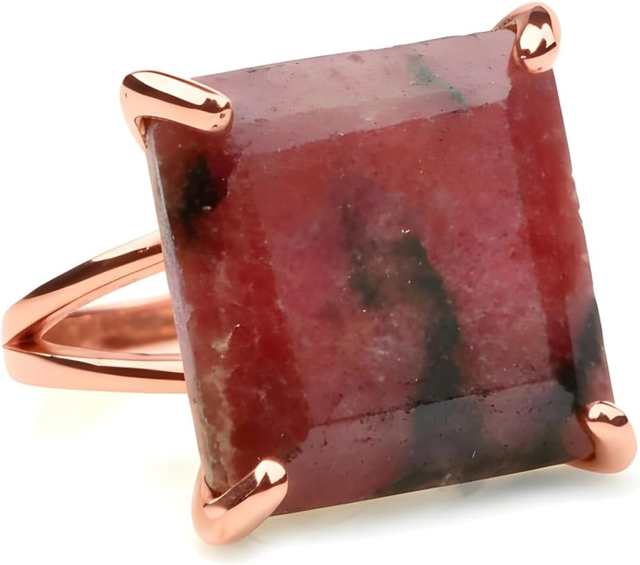 This handcrafted 14k rose gold rhodonite ring features a bold square-cut stone in deep pink and charcoal tones. The double-band setting offers a refined presence while keeping the focus on the natural gemstone. Designed for gifting and everyday wear, this piece brings color, texture, and a warm gold finish together in a clean, modern profile.