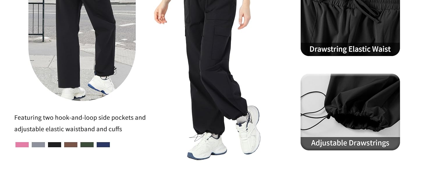 تصميم تفصيلي: تتميز سراويل كارجو المظلة النسائية هذه بـ 4 جيوب تخزين، بما في ذلك جيبين جانبيين بخطاف وحلقة. يوفر حزام الخصر المرن القابل للتعديل مقاسًا عالي الخصر، بينما يمكن ربط الأساور للحصول على مظهر فضفاض أو مدبب.