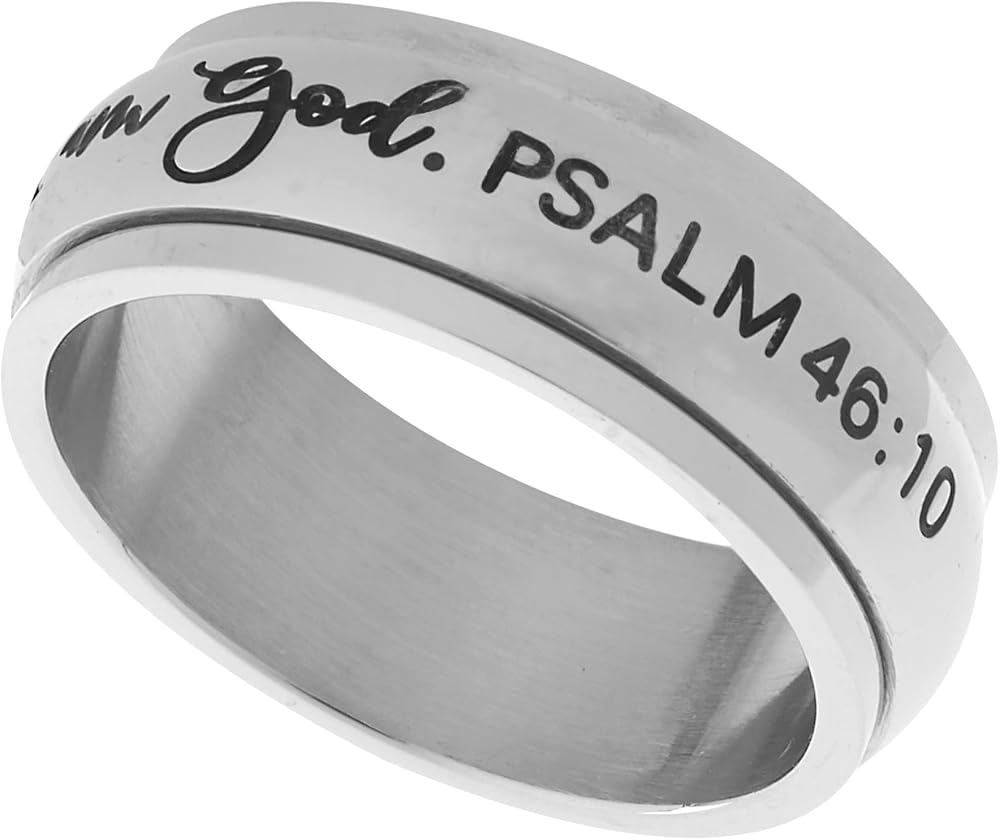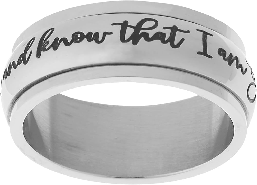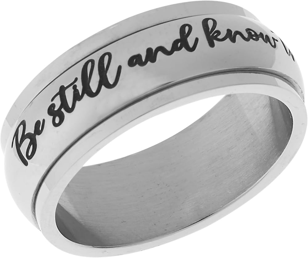 An 8mm Spinner Ring with a motivational message engraved "Be Still and Know That I am God ", Psalm 46:10, that will give you more confidence, strength, power, and determination. A great reminder to the people who are down, facing challenges and troubles in life!