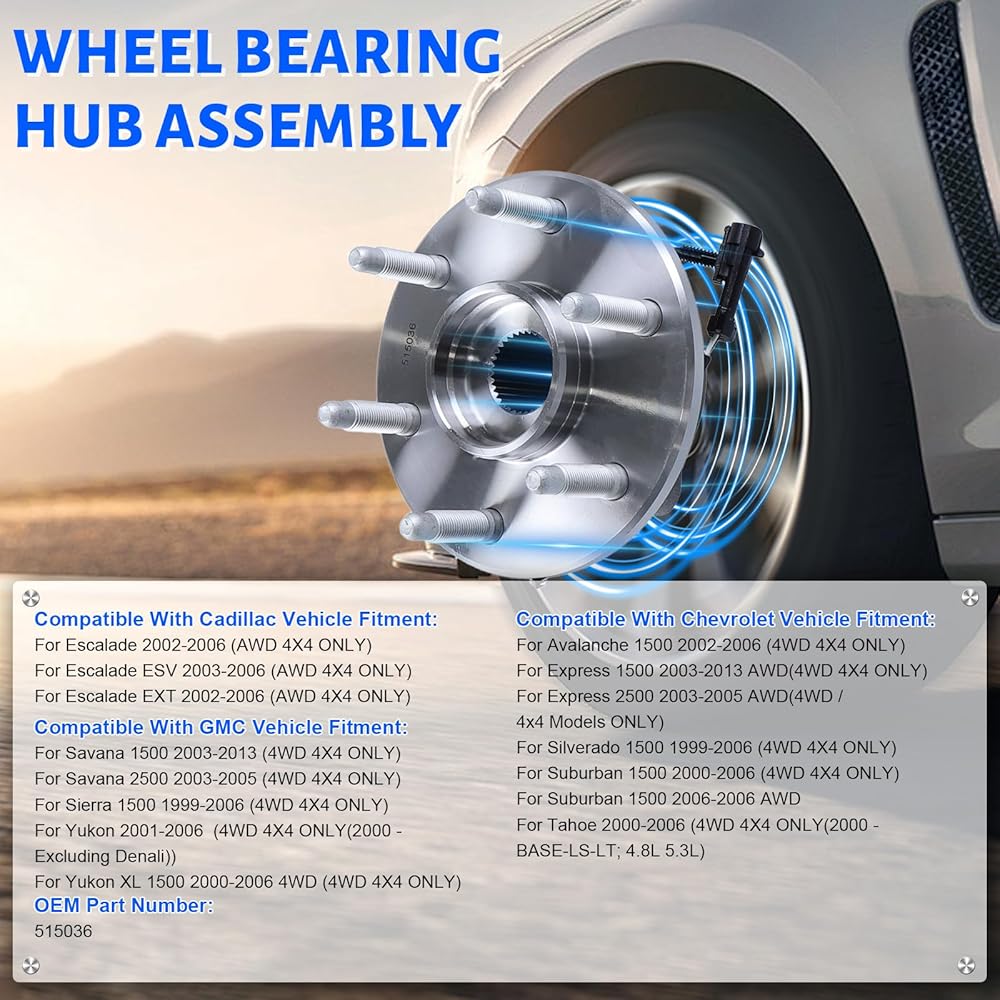 Vehicles Fitment: Hub assembly Compatible with Chevy Avalanche 1500 2002-2006, fit for Chevrolet Tahoe 2000-2006 , fit for Cadillac Escalade ESV 2003-2006, fit for GMC Savana 2500 2003-2005, fit for GMC Sierra 1500 1999-2006, fit for GMC Yukon XL 1500 2000-2006