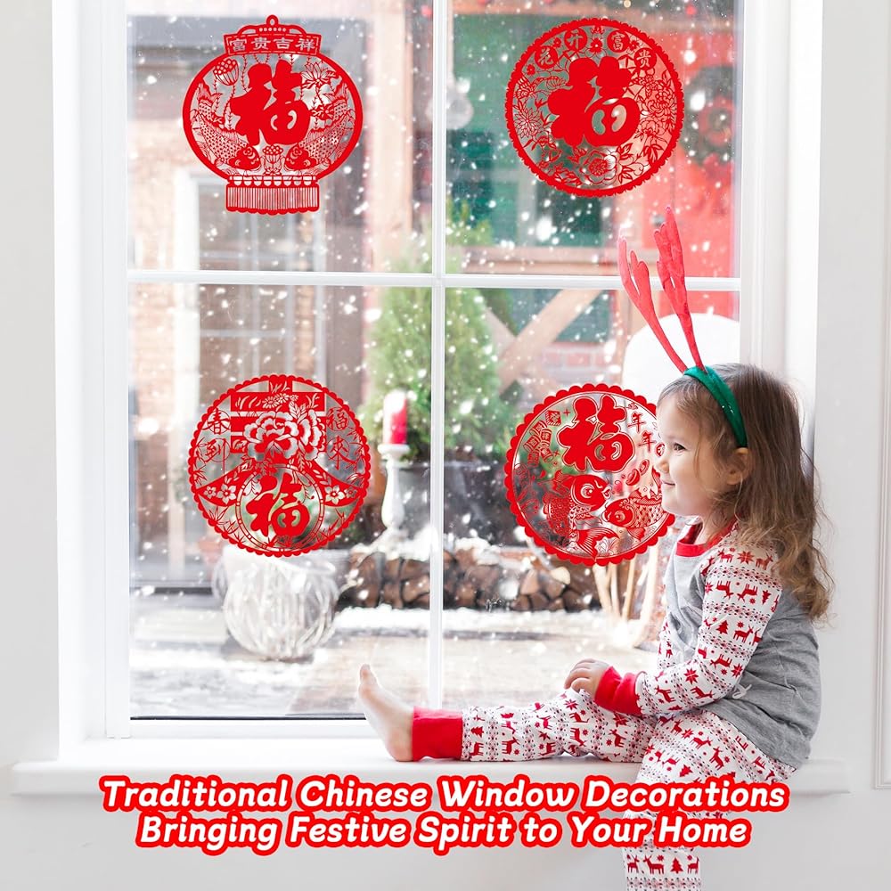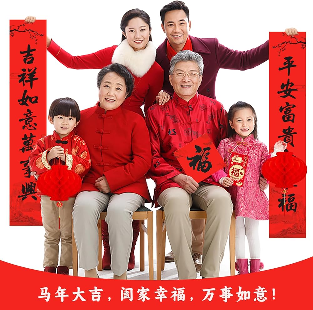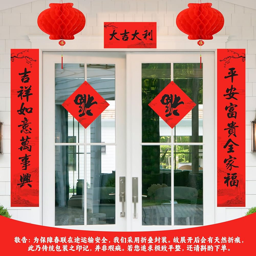• new years decorations Convenient and Easy to Use --- This Chinese New Year decorations set comes with adhesive films, making it easy to mount the couplets, Fu characters and other decorations securely in place. These adhesive films are perfect for sticking decorations to walls, doors. For the window flowers, simply add a small amount of water to them, and they will easily stick to glass surfaces—no adhesive required. To create an inviting atmosphere for your family gatherings, New Year parties, or storefront displays, this set provides all the essential pieces, whether you're decorating your home, office