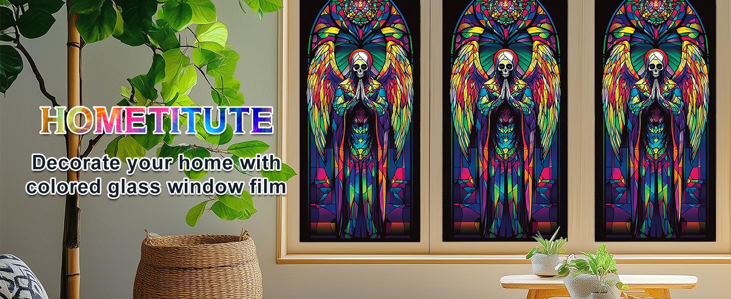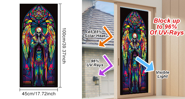 Rainbow Judgment Gothic Skull Angel: يتميز فيلم النوافذ الزجاجي الملون PVC هذا بملاك هيكلي بأجنحة قوس قزح مشعة ووضعية صلاة، ويمزج بين الرمزية المقدسة والرومانسية الداكنة لإنشاء فيلم خصوصية نابض بالحياة ولكنه رسمي للنوافذ الزجاجية