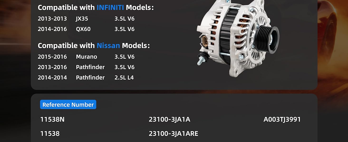 【Exact Fit & Broad Compatibility】: Direct replacement alternator fit for (11538N,11538,23100-3JA1A,23100-3JA1ARE,A003TJ3991). Verify your vehicle details and part number for a perfect, hassle-free fitment