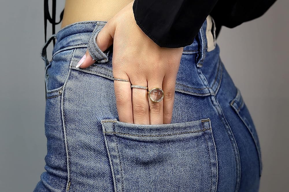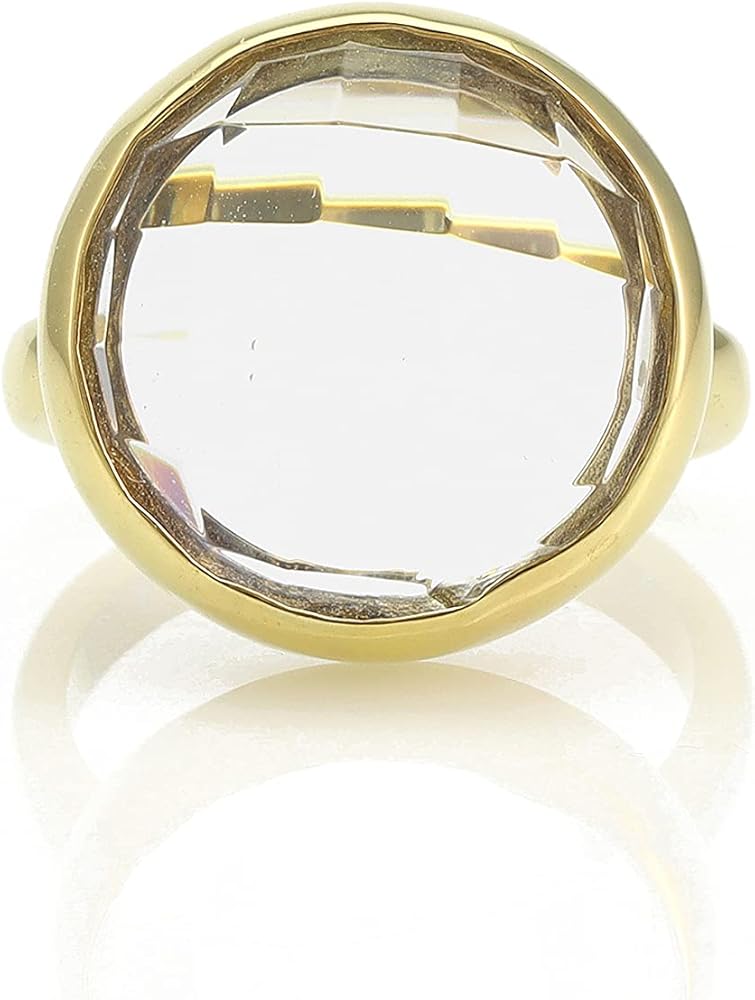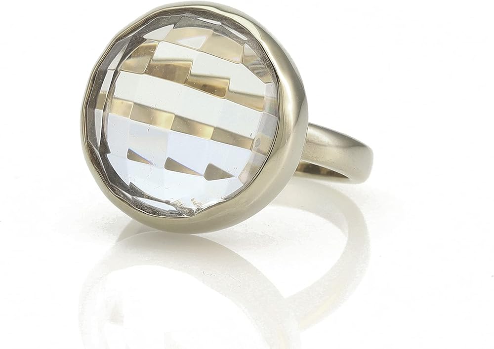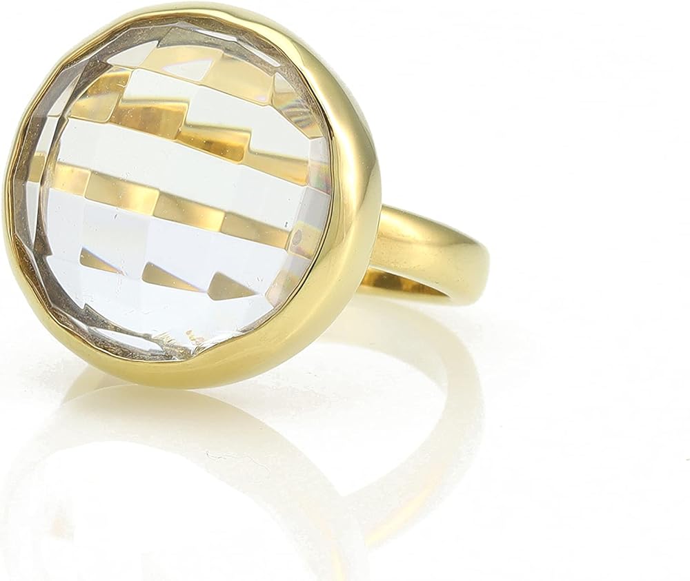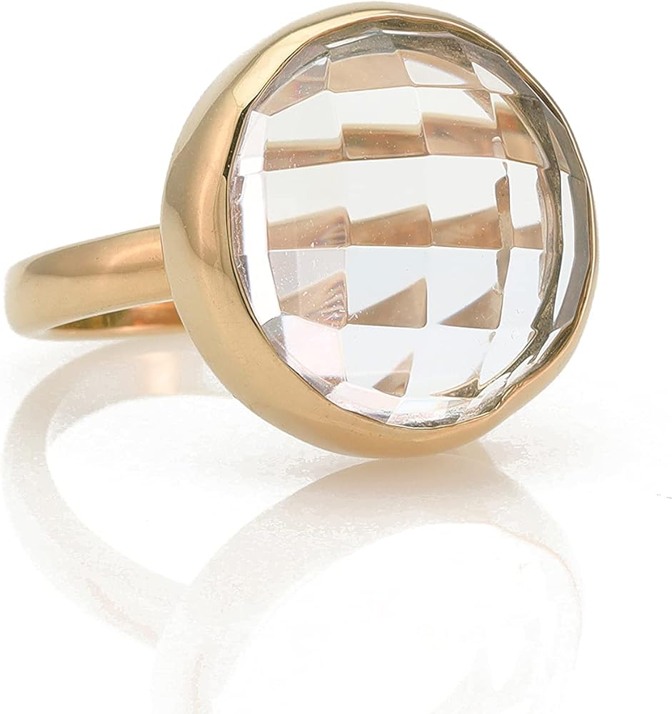 Sophisticated piece from our collection of crystal rings for women crafted with a Crystal Quartz centerpiece set in bezel. This fashion jewelry is a great starter for your statement jewelry collection. A custom gold ring you can wear with your favorite pieces.