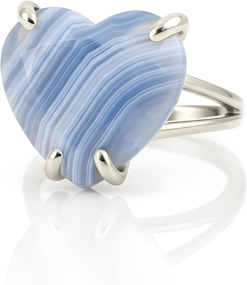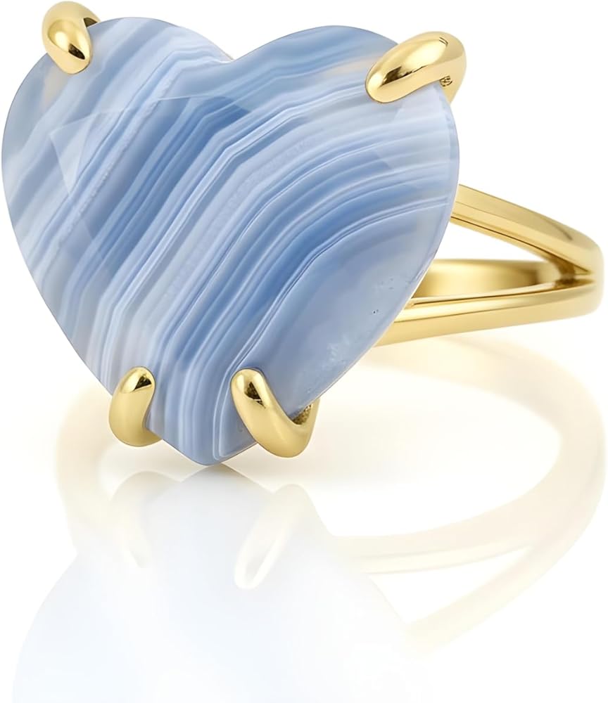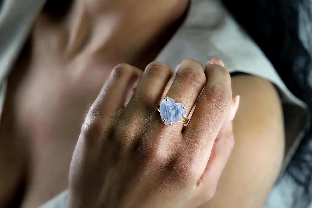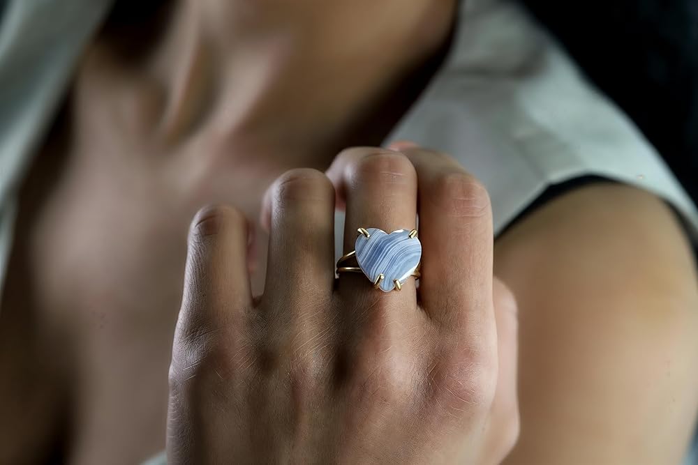 This blue lace agate ring is crafted in 14k gold, featuring a heart-shaped gemstone set in a polished double band design. The soft blue patterns of lace agate bring calmness and beauty, making it both meaningful and stylish. Designed as a solitaire ring, it combines timeless elegance with the healing qualities of semiprecious gemstones. Handcrafted with care, this heart ring is perfect as a love-inspired gift, a personal treasure, or a striking addition to any jewelry collection.