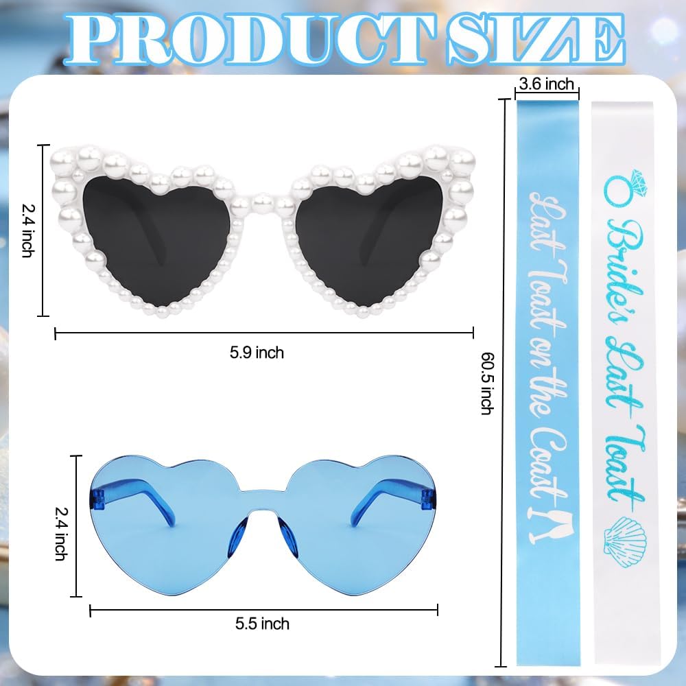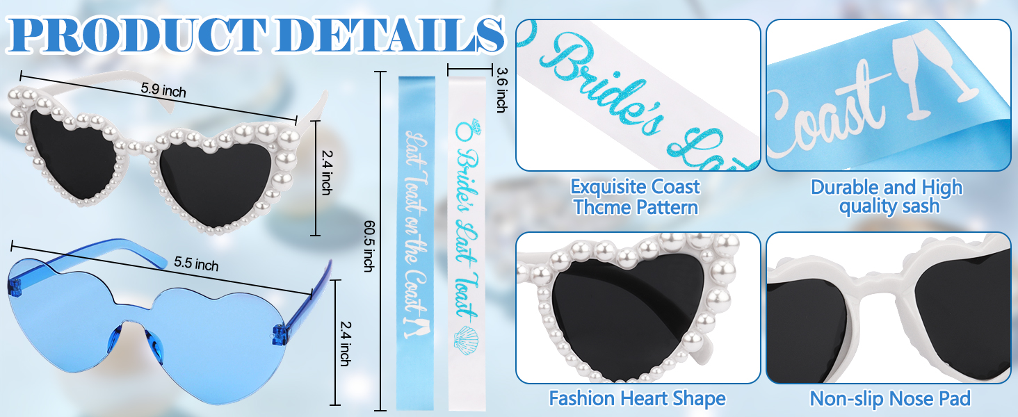 خامة عالية الجودة: النظارات الشمسية مصنوعة من البلاستيك واللؤلؤ خفيف الوزن عالي الجودة، تصميم وسادة الأنف من قطعة واحدة لن يضغط على جسر أنفك لفترة طويلة، مما يمنحك تجربة ارتداء فريدة ومريحة. أوشحة توديع العزوبية للعروس مصنوعة من وشاح ساتان ناعم عالي الجودة مع حروف من الرقائق المعدنية