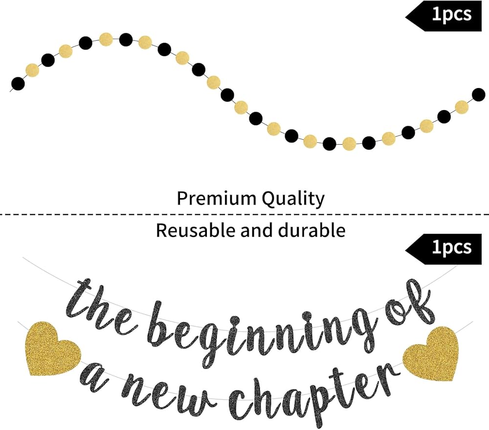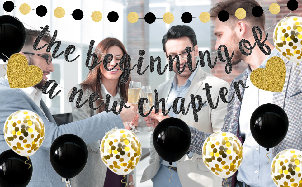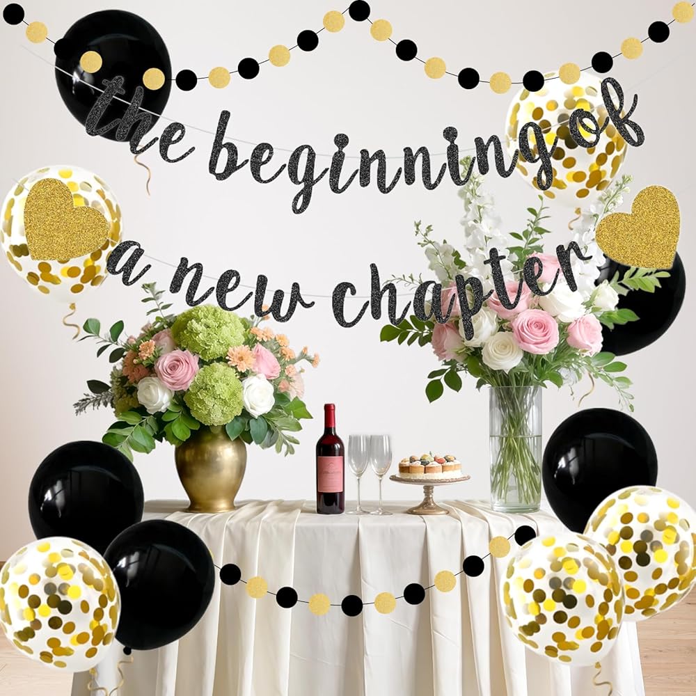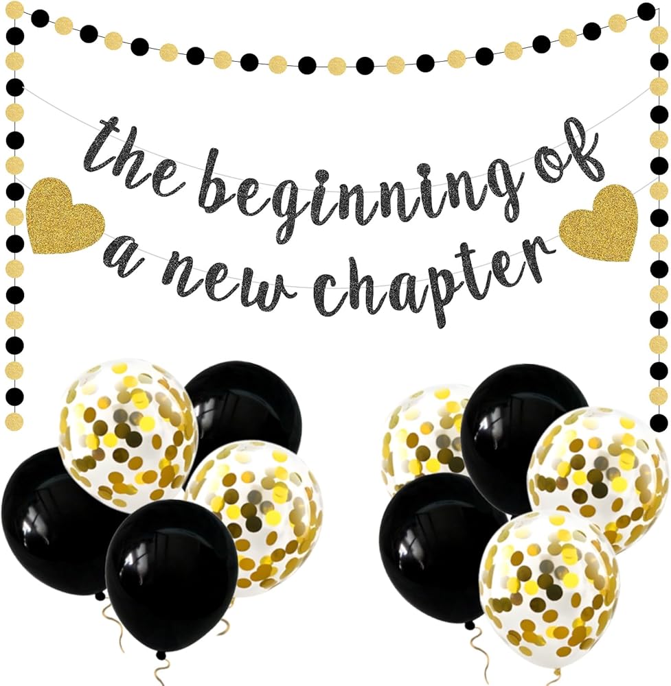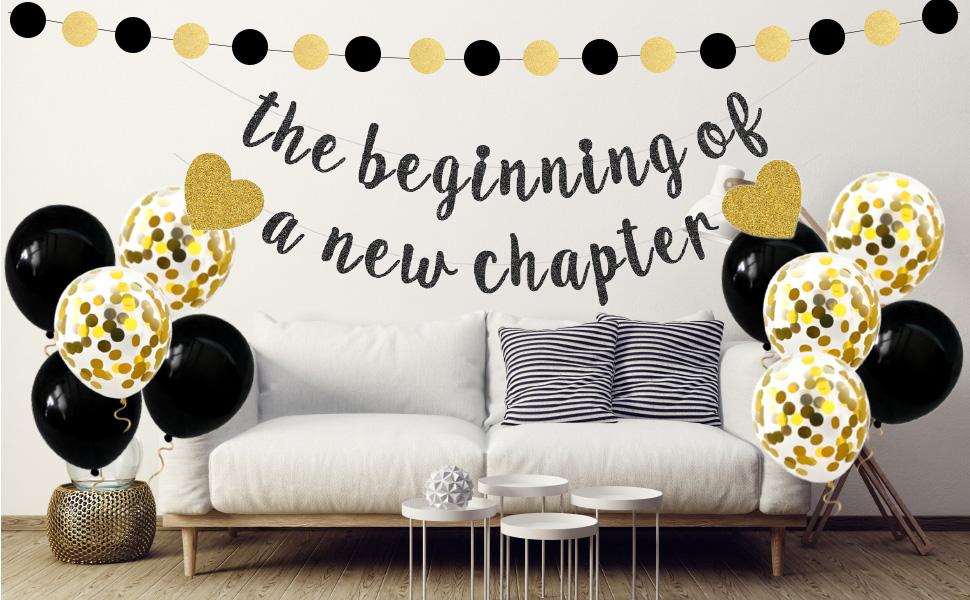 What You Get:1 x Black The Beginning of a New Chapter funny banner, 10 x ballons(5pcs black + 5 golden confetti ballons),1 x Paper Dot Hanging Garland. Perfect for all kinds of events, this party banner set will create a romantic atmosphere and leave a lasting impression.Complete set to meet your needs when party decoration, no need to buy other accessories. When your party is approaching, prepare a set of party supplies to celebrate!