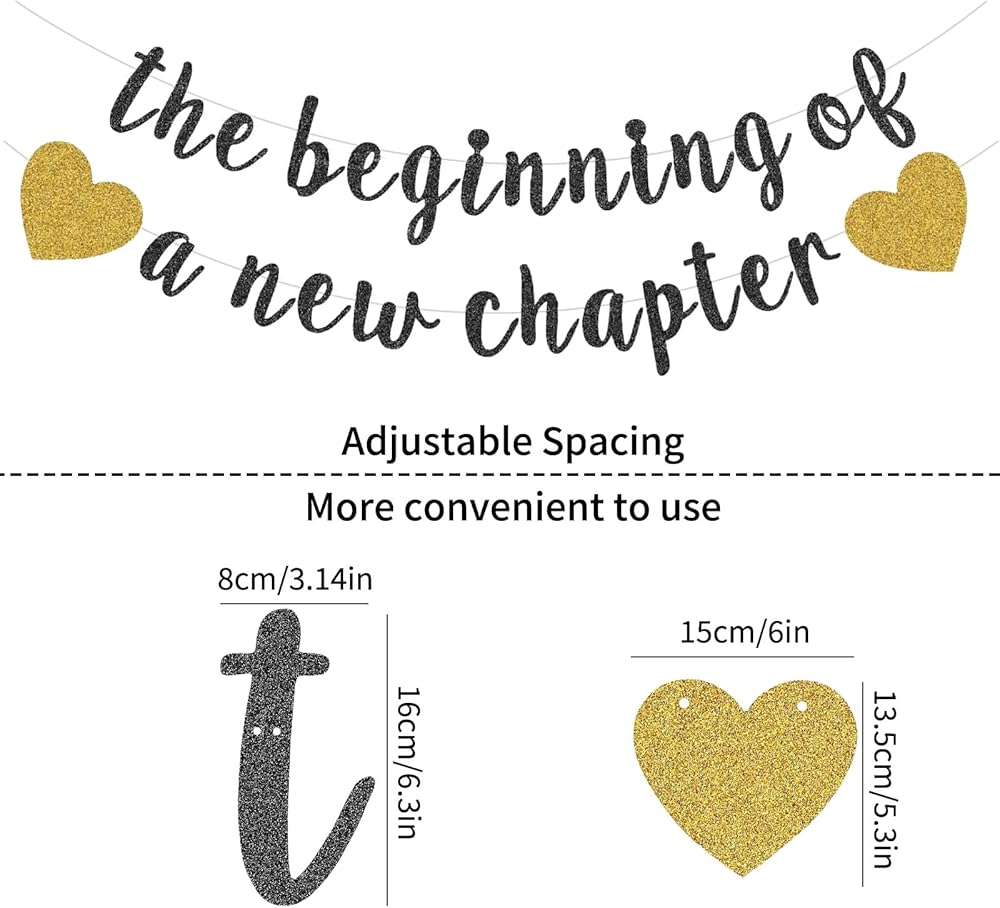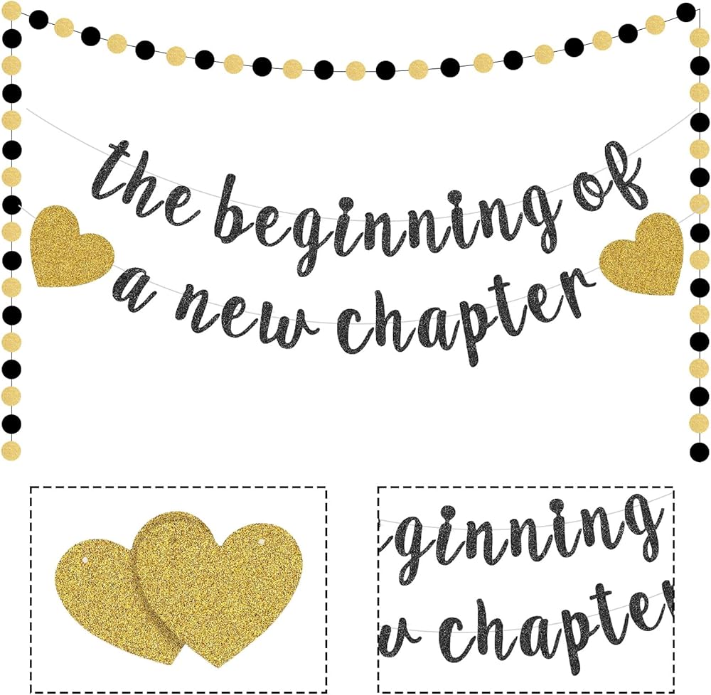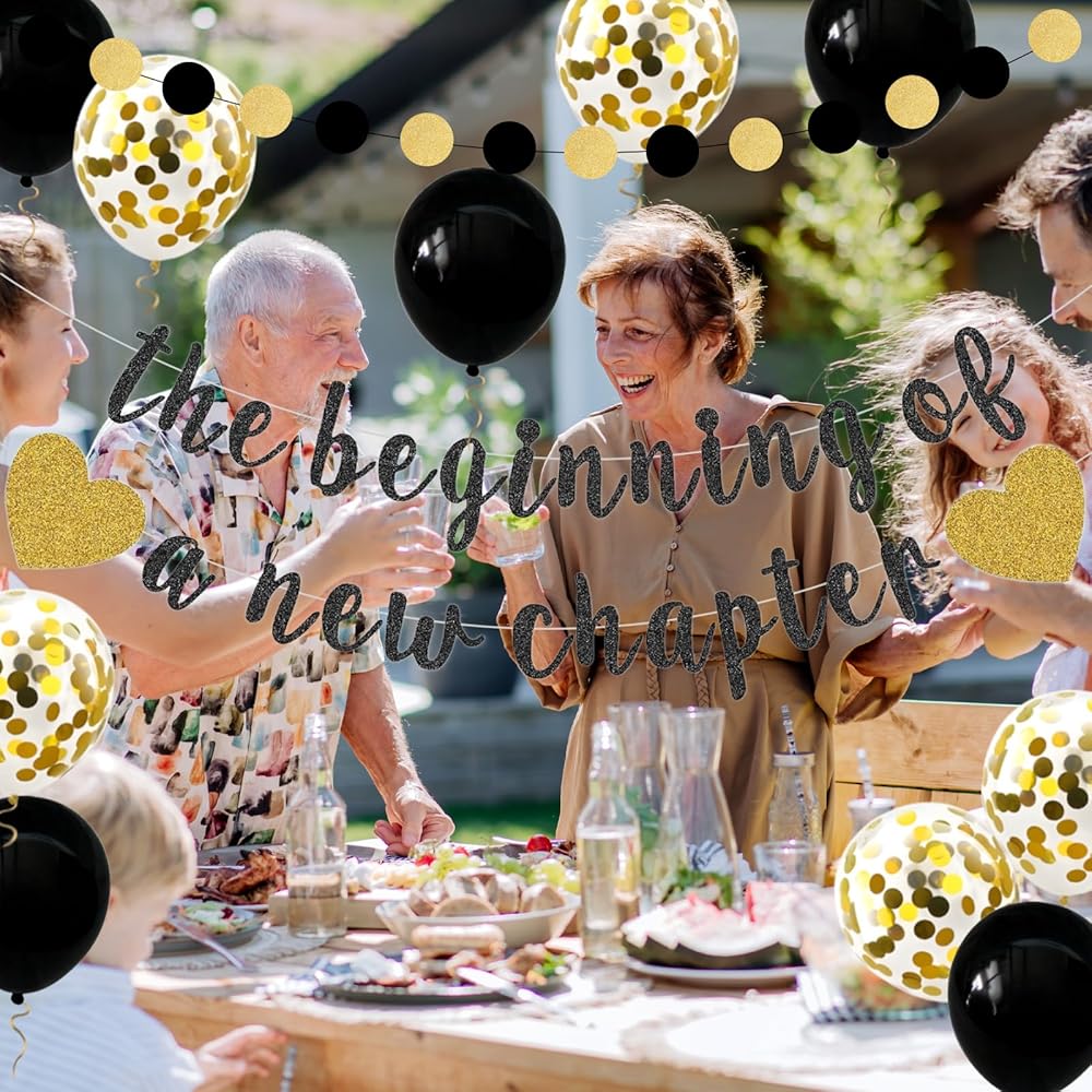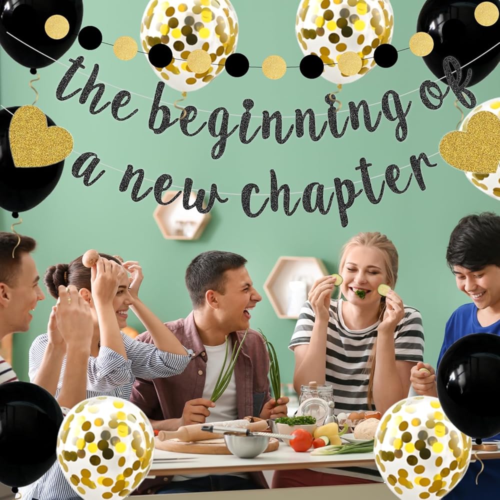 What You Get:1 x Black The Beginning of a New Chapter funny banner, 10 x ballons(5pcs black + 5 golden confetti ballons),1 x Paper Dot Hanging Garland. Perfect for all kinds of events, this party banner set will create a romantic atmosphere and leave a lasting impression.Complete set to meet your needs when party decoration, no need to buy other accessories. When your party is approaching, prepare a set of party supplies to celebrate!