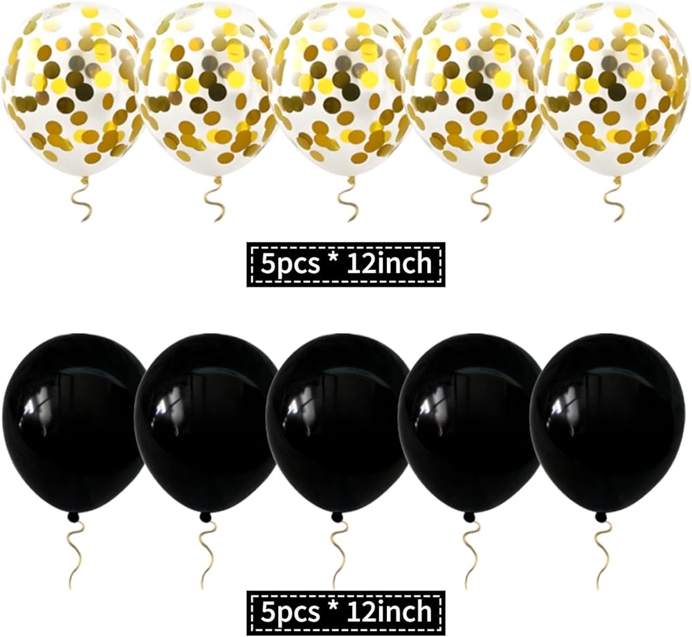 10 x Ballons:Includes 5 black balloons and 5 golden confetti, each approximately 12 inches in size. All are crafted from soft, elastic latex material, offering a comfortable texture and exceptional durability, making them perfect for party decorations. Balloons arrive slightly deflated and can be inflated with air or nitrogen. For inflation, fill to 80% capacity to avoid overinflation.