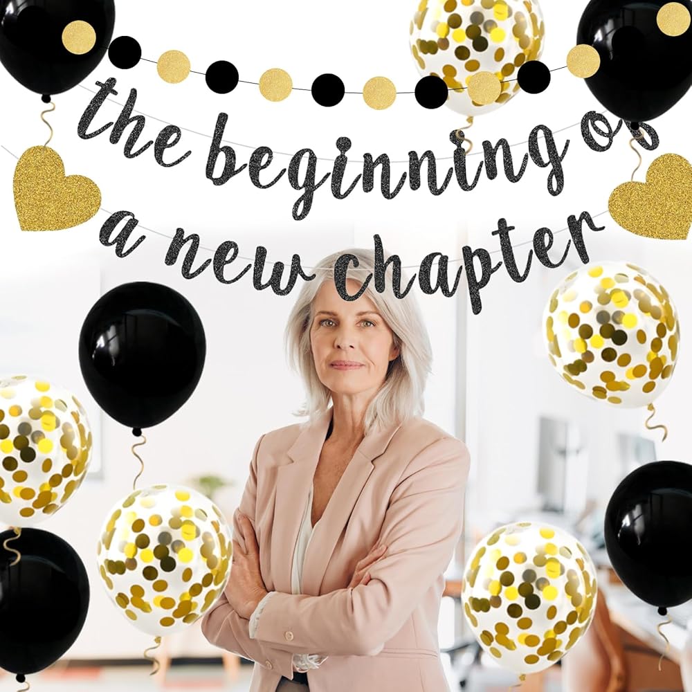 The Beginning of a New Chapter Banner Black Gold Glitter Hanging Garland Kit with Balloons Bunting Backdrop for Farewell Graduation Away Happy Retirement Party Decorations Supplies Adult Celebration