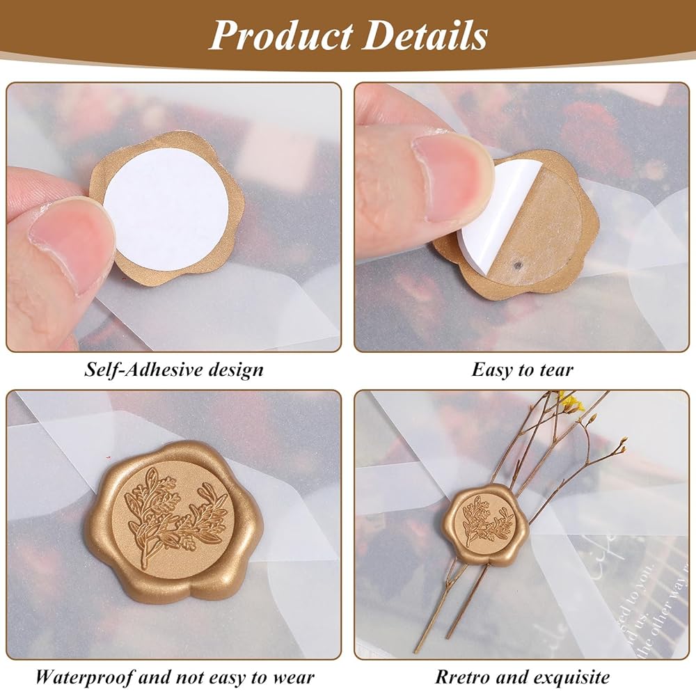 Convenient Self-Adhesive Backing: Forget the mess of traditional melted wax. These stickers have a simple peel-and-stick adhesive backing, allowing you to achieve the luxurious look of a wax seal in seconds without any tools or cleanup