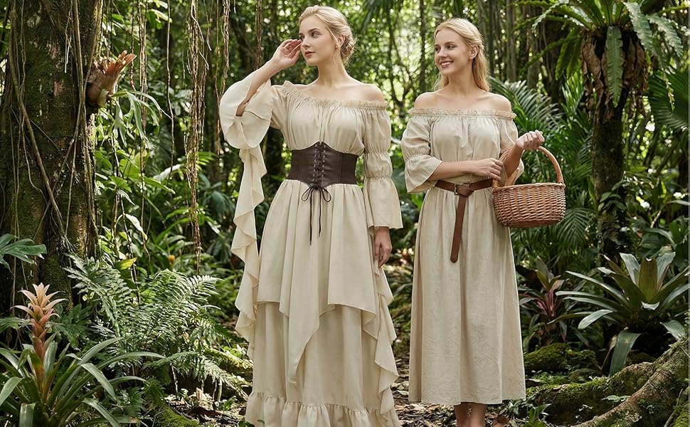 ميزات العصور الوسطى: فستان فيكتوري للسيدات يتميز بخط رقبة مرن وناعم، بدون أكتاف، وأكمام طويلة على شكل جرس، وخصر مرتفع، وحاشية ذات طبقات، وطول طويل. فستان عصر النهضة بدون أكتاف سيظهر خطوط رقبة أكثر جمالاً، مناسب لجسمك تمامًا، الطول الأقصى سيجعلك أكثر نحافة ونحافة